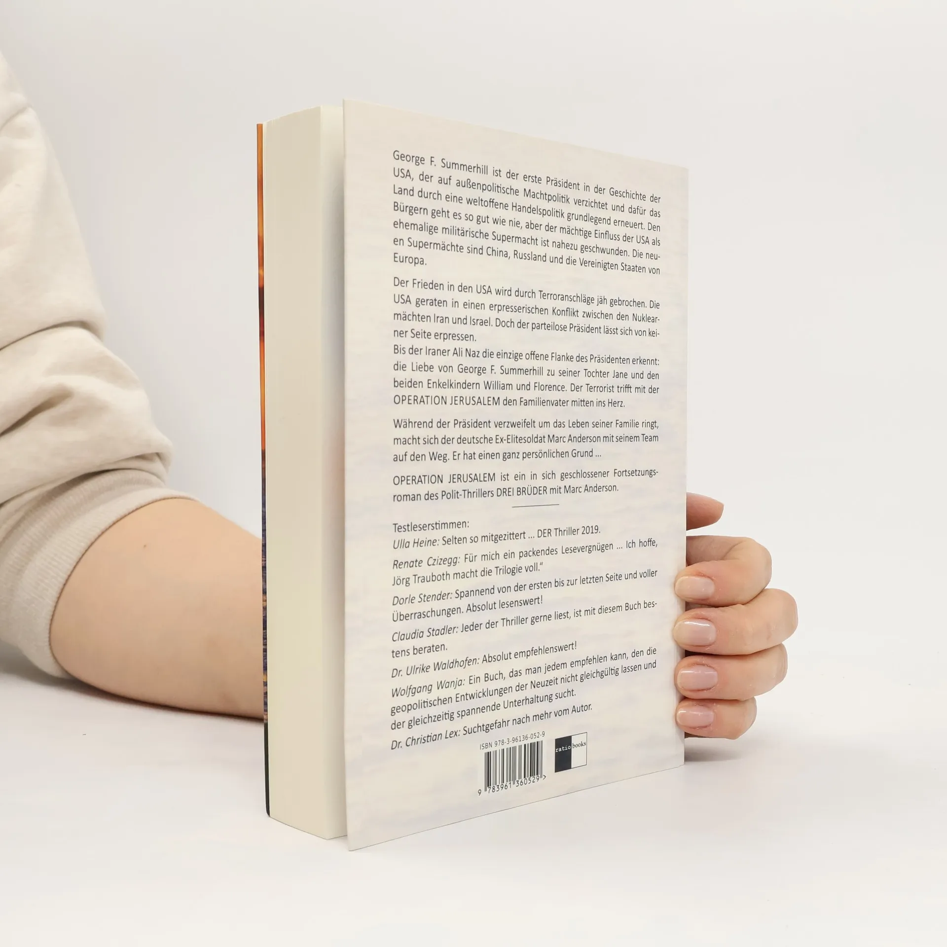 George F. Summerhill ist der erste Präsident in der Geschichte der USA, der auf außenpolitische Machtpolitik verzichtet und dafür das Land auf der Grundlage einer weltoffenen Handelspolitik grundlegend erneuert. Den Bürgern geht es so gut wie nie, aber der mächtige Einfluss der USA als ehemalige militärische Supermacht ist nahezu geschwunden. Die neuen Supermächte sind China, Russland und ein wiedererstarktes Europa.Durch islamistische Terrorakte gegen Einrichtungen der USA gerät der Präsident in einen außenpolitischen Konflikt. Israel fordert ein araberfreies Land ohne palästinensische Autonomiegebiete und wird hierbei von dem Sohn des Präsidenten, David, subversiv unterstützt. Die Terroristen fordern die Aberkennung des Staates Israel und die Anerkennung des Staates Palästina. Der Konflikt zwischen den Nuklearmächten Iran und Israel heizt sich auf. Die Welt steht vor einem Abgrund. Doch der U.S. Präsident lässt sich weder durch Israel noch durch die Terroristen erpressen, bis der Iraner Ali Naz die einzige offene Flanke des Präsidenten Die Liebe von George F. Summerhill zu seiner Tochter Jane und den beiden Enkelkindern William und Florence. Ali Naz trifft mit der Operation Jerusalem den Familienvater mitten ins Herz.Während der Präsident um das Leben seiner Familie ringt, macht sich der deutsche Ex-Elitesoldat Marc Anderson mit seinem Team auf den Weg. Er hat einen ganz persönlichen Grund ...