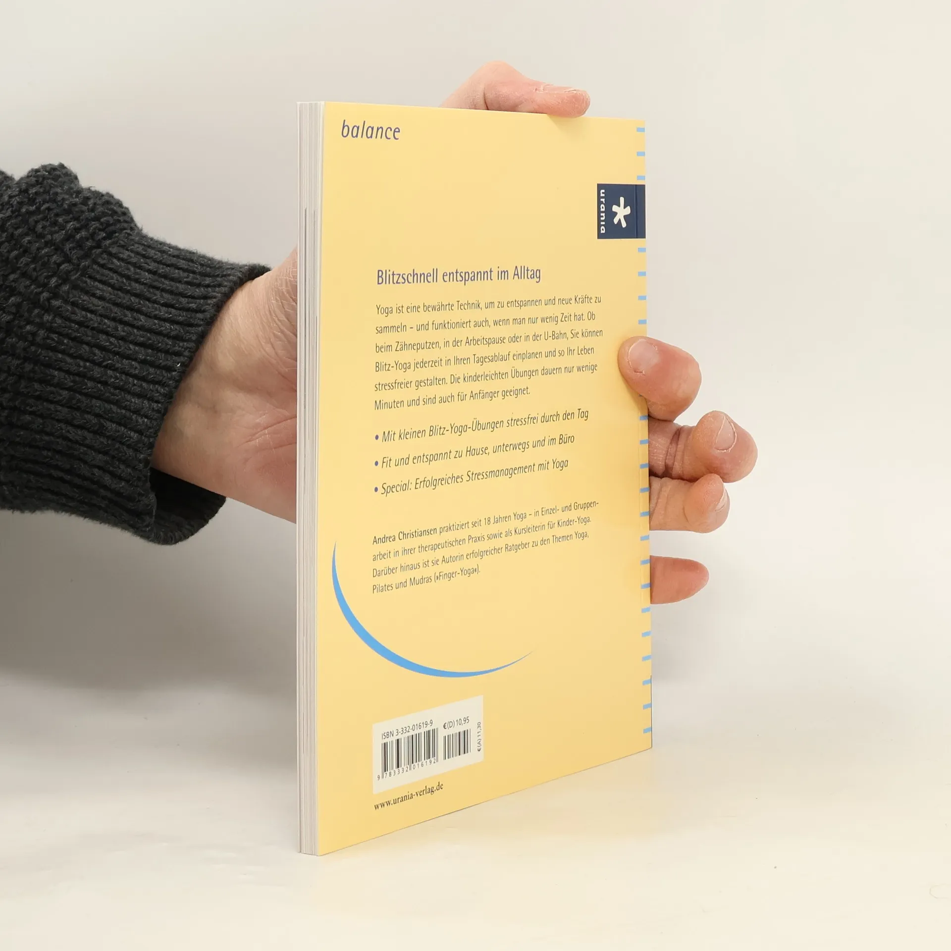 Yoga ist eine bewährte Technik, um zu entspannen und neue Kräfte zu sammeln, und funktioniert auch, wenn man nur wenig Zeit hat. Ob beim Zähneputzen, in der Arbeitspause oder in der U-Bahn – Blitz-Yoga bringt schnell und effektiv Ruhe und Entspannung in den Alltag. Die kinderleichten Übungen dauern nur wenige Minuten und sind auch für Laien geeignet. Abgerundet werden sie durch kurze Meditationen und Tipps aus der Aromatherapie.