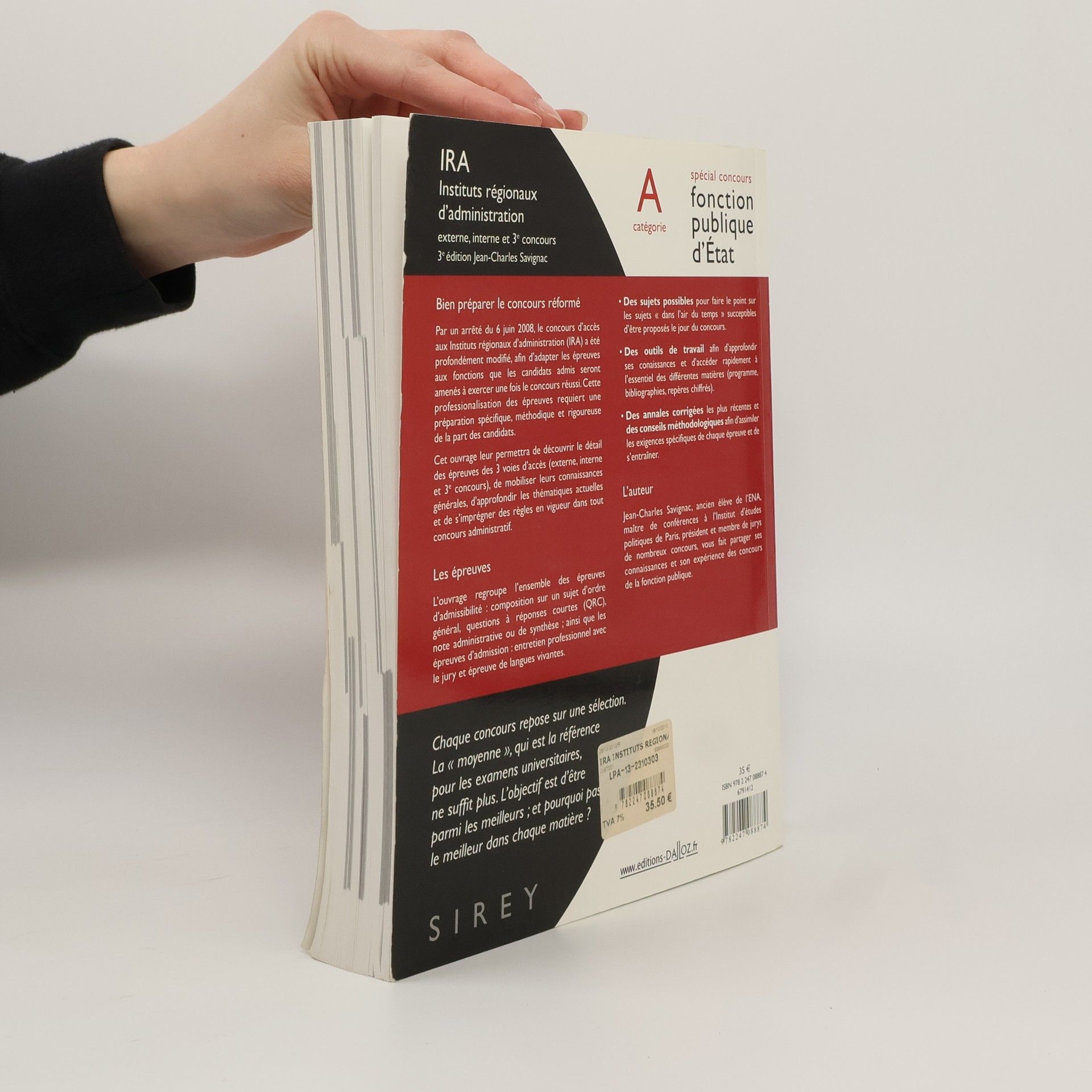 Bien préparer le concours réformé Par un arrêté du 6 juin 2008, le concours d'accès aux Instituts régionaux d'administration (IRA) a été profondément modifié, afin d'adapter les épreuves aux fonctions que les candidats admis seront amenés à exercer une fois le concours réussi. Cette professionnalisation des épreuves requiert une préparation spécifique, méthodique et rigoureuse de la part des candidats. Cet ouvrage leur permettra de découvrir le détail des épreuves des 3 voies d'accès (externe, interne et 3e concours), de mobiliser leurs connaissances générales, d'approfondir les thématiques actuelles et de s'imprégner des règles en vigueur dans tout concours administratif. Les épreuves L'ouvrage regroupe l'ensemble des épreuves d'admissibilité : composition sur un sujet d'ordre général, questions à réponses courtes (QRC), note administrative ou de synthèse . ainsi que les épreuves d'admission : entretien professionnel avec le jury et épreuve de langues vivantes. Des sujets possibles pour faire le point sur les sujets « dans l'air du temps » susceptibles d'être proposés le jour du concours. Des outils de travail afin d'approfondir ses connaissances et d'accéder rapidement à l'essentiel des différentes matières (programme, bibliographies, repères chiffrés).' Des annales corrigées les plus récentes et des conseils méthodologiques afin d'assimiler les exigences spécifiques de chaque épreuve et de s'entraîner. L'auteur Jean-Charles Savignac, ancien élève de l'ENA, maître de conférences à l'Institut d'études politiques de Paris, président et membre de jurys de nombreux concours, vous fait partager ses connaissances et son expérience des concours de la fonction publique.