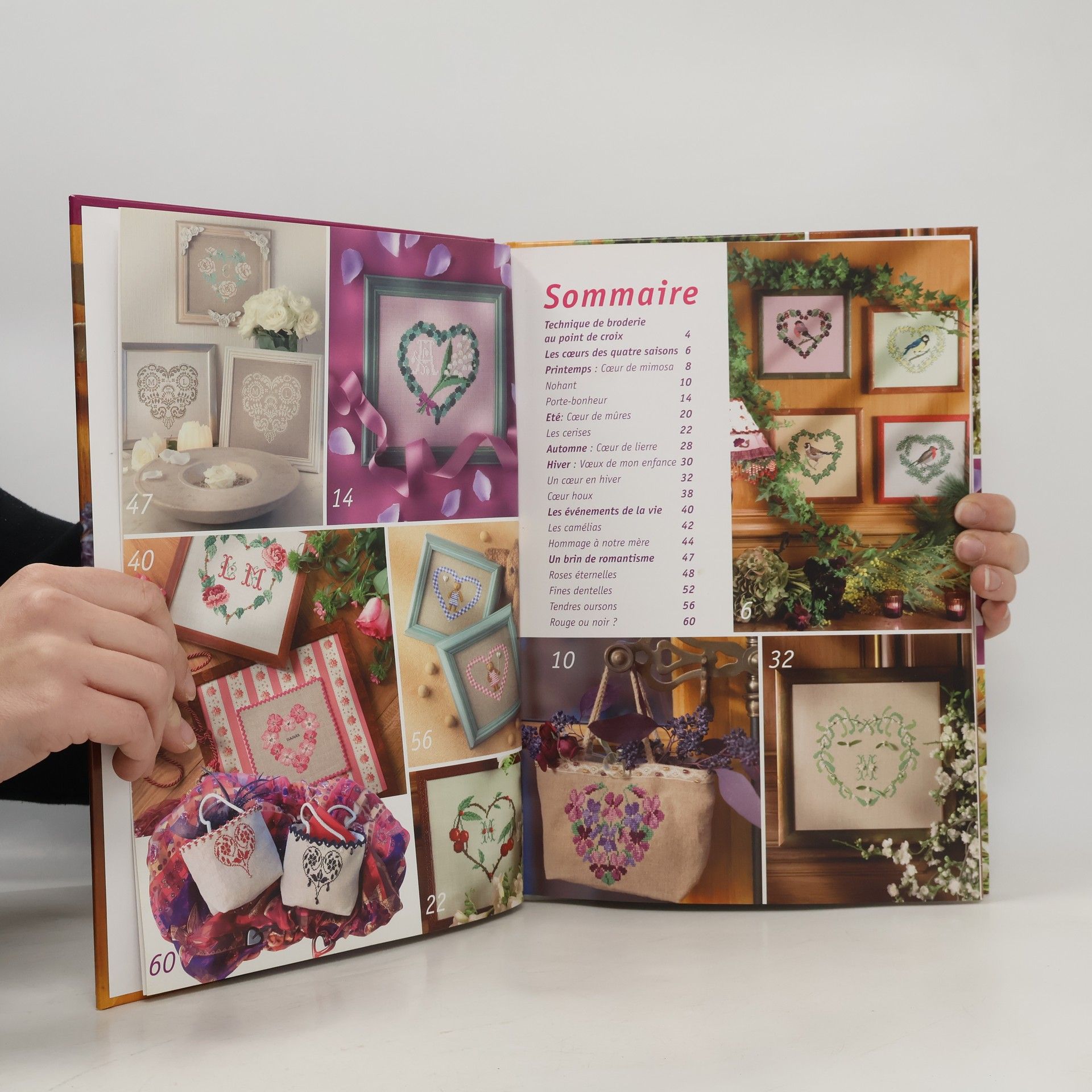 Quinze coeurs et trois modèles de sacs à broder au point de croix pour toutes les occasions et pour toutes les saisons, sont proposés autour du thème de la nature : coeur de mimosa, coeur de lierre, coeur de rose, coeur de houx, mésange, chardonneret, rouge-gorge. Pour chaque modèle, une grille en couleurs.