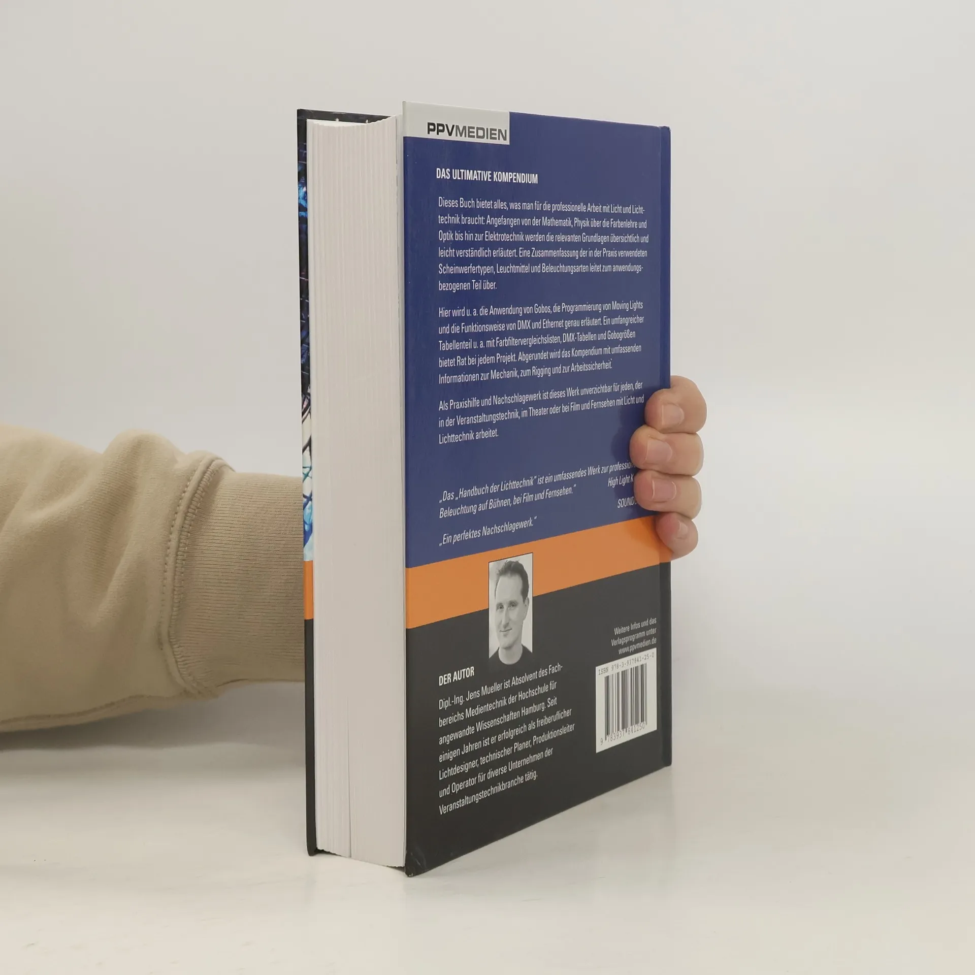 PPV Medien Handbuch der LichttechnikDieses Buch bietet alles, was man bei der täglichen Arbeit mit Licht und Lichttechnik braucht: Angefangen von der Mathematik, Physik über die Farbenlehre und Optik bis hin zur Elektrotechnik werden die relevanten Grundlagen übersichtlich und leicht verständlich erläutert. Eine Zusammenfassung der in der Praxis verwendeten Scheinwerfertypen und Leuchtmittel leitet zum anwendungsbezogenen Teil über.Hier wird u.a. die Anwendung von Gobos, die Programmierung von Moving Lights und die Funktionsweise von DMX und Ethernet genau erläutert. Ein umfangreicher Tabellenteil u.a. mit Farbfiltervergleichslisten, DMX-Tabellen und Gobogrößen bietet Rat bei jedem Projekt. Abgerundet wird das Kompendium mit umfassenden Informationen zur Mechanik, zum Rigging und zur Arbeitssicherheit.Als Praxishilfe und Nachschlagewerk ist dieses Werk unverzichtbar für jeden, der in der Veranstaltungstechnik, im Theater oder bei Film und Fernsehen mit Licht und Lichttechnik arbeitet.Features: ISBN: 978-3-937841-25-0 Umfang: 524 Seiten Format: 22,5 x 15,5 cm Beschaffenheit: Hardcover