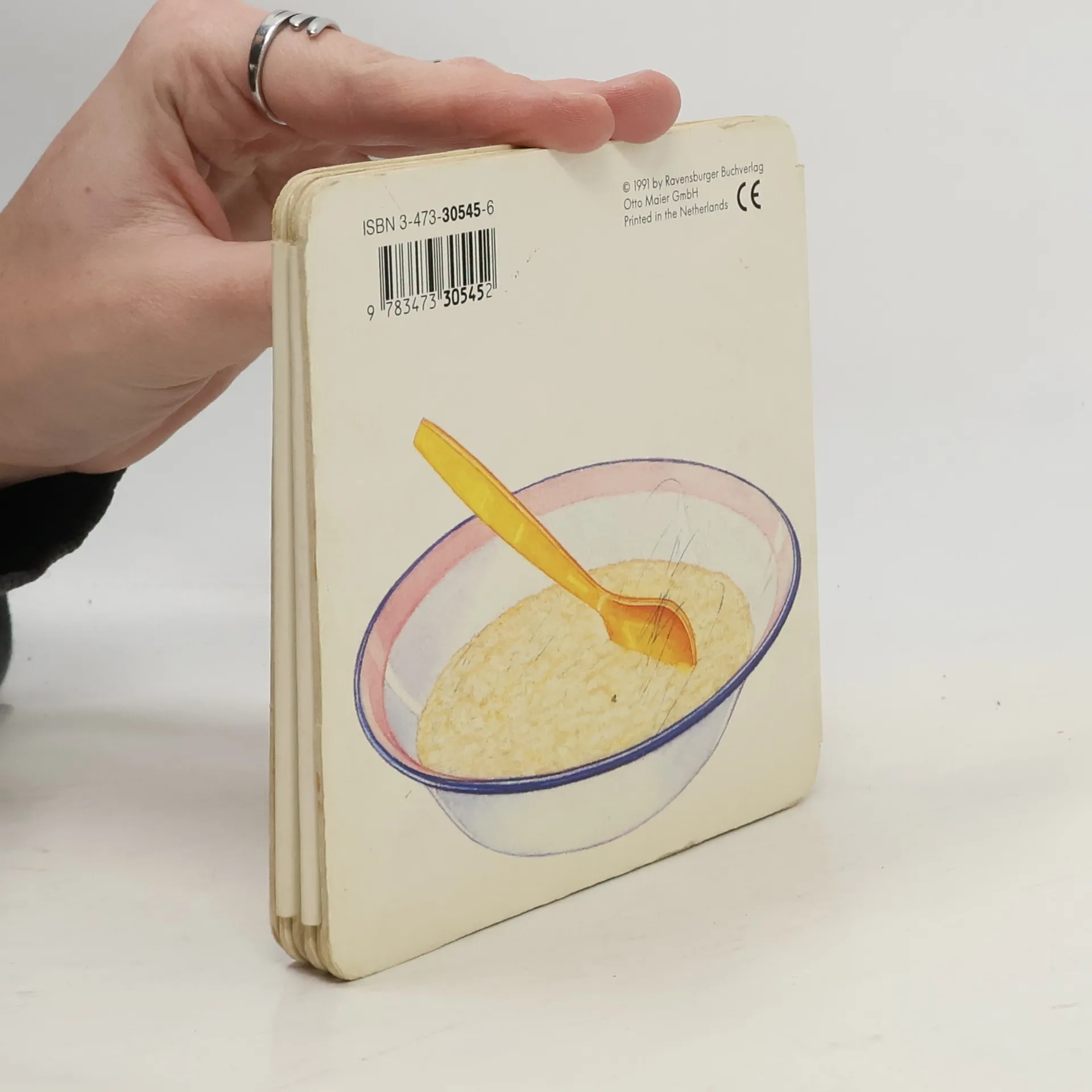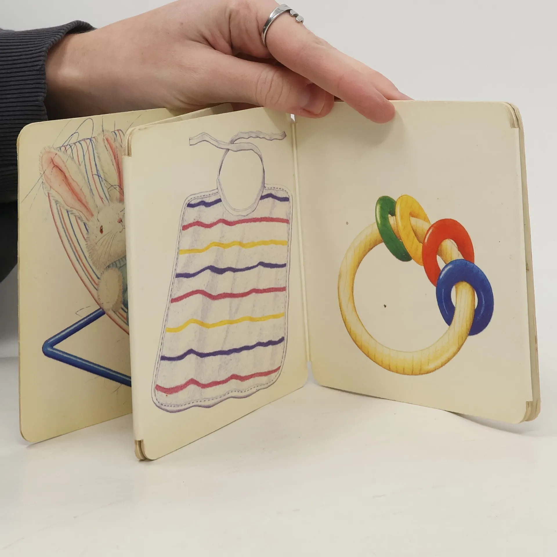 Pegebog med tegninger af bl.a. babystol, sutteflaske, hagesmæk, rangle, banan, bamse med ble, børste og tøjbold