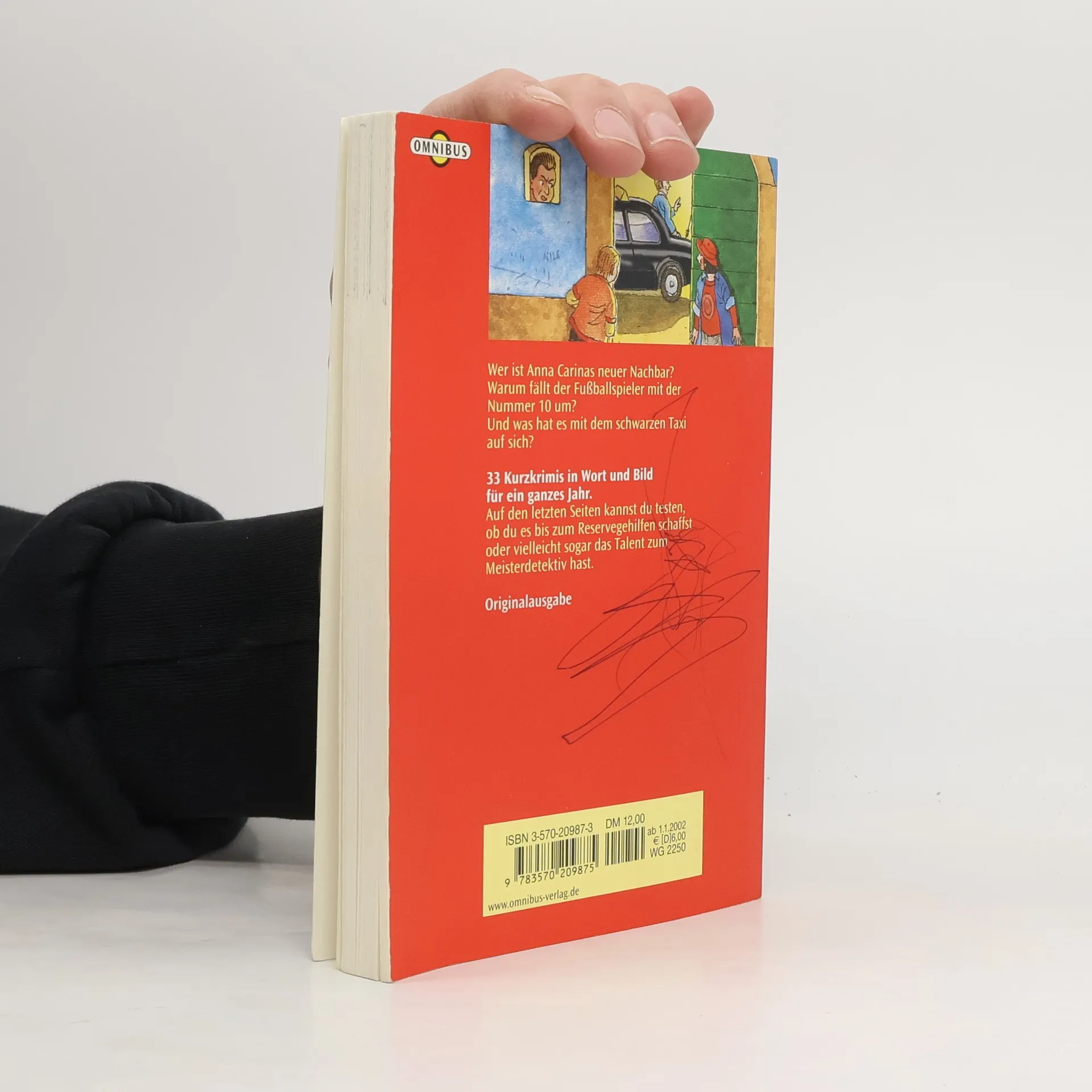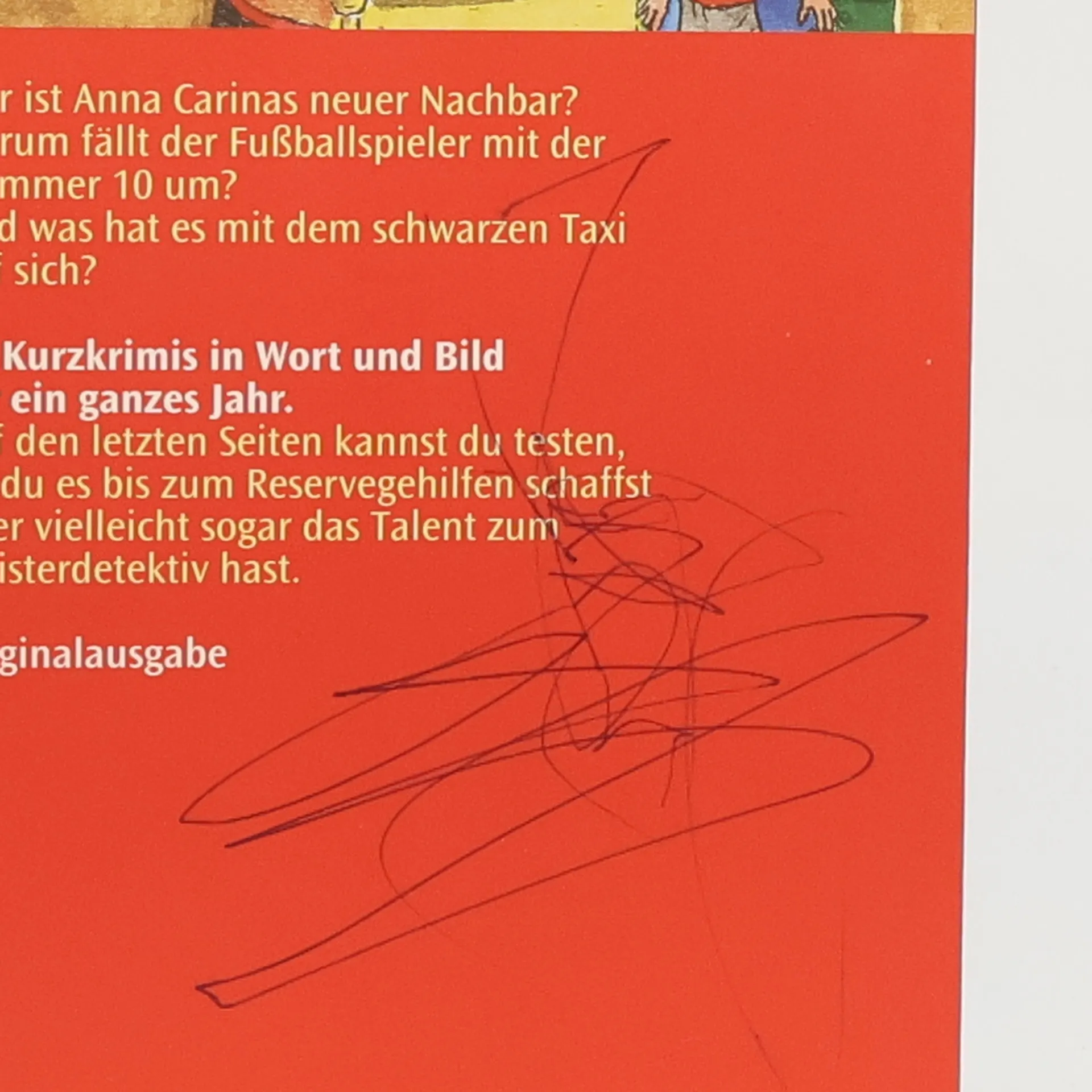 Wer ist Anna Carinas neuer Nachbar ? Warum fällt der Fussballspieler mit der Nummer 10 um ? Und was hat es mit dem schwarzen Taxi auf sich ? 33 Kurzkrimis in Wort und Bild für ein ganzes Jahr. Auf den letzten Seiten kannst du testen, ob du es bis zum Reservegehilfen schaffst oder vielleicht sogar das Talent zum Meisterdetektiv hast