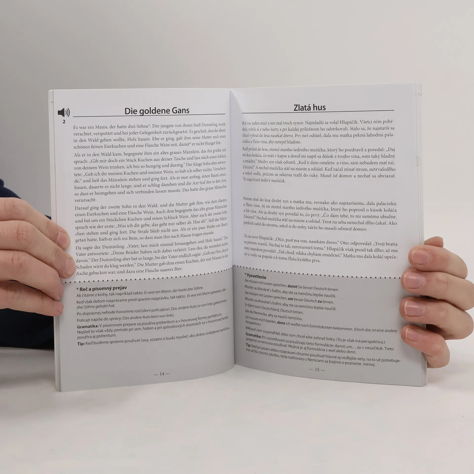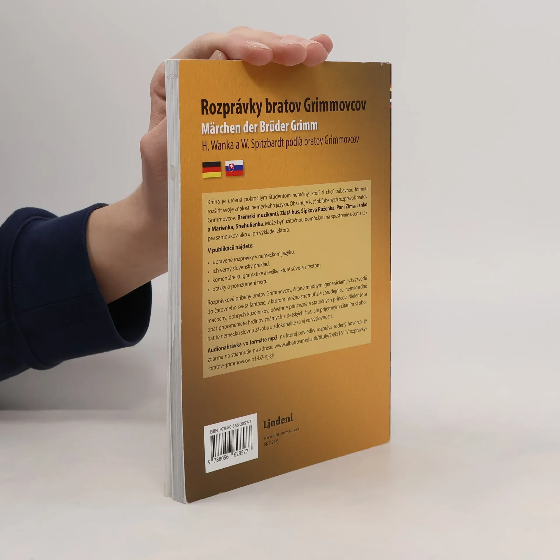 Obľúbené rozprávky bratov Grimmovcov upravené pre výučbu! Kniha je určená pokročilým študentom nemčiny, ktorí si chcú zábavnou formou rozšíriť svoje znalosti nemeckého jazyka. Obsahuje šesť obľúbených rozprávok bratov Grimmovcov: Brémski muzikanti, Zlatá hus, Šípková Ruženka, PaniZima, Janko a Marienka, Snehulienka. Môže byť užitočnou pomôckou na spestrenie učenia tak pre samoukov, ako aj výkladu lektora. V publikácii nájdete: • upravené rozprávky v nemeckom jazyku, • ich verný slovenský preklad, • komentáre ku gramatike a lexike, ktoré súvisia s textom, • otázky o porozumení textu. Rozprávkové príbehy bratov Grimmovcov, čítané mnohými generáciami, vás zavedú do čarovného sveta fantázie, v ktorom možno stretnúť zlé čarodejnice, nemilosrdné macochy, dobrých kúzelníkov, pôvabné princezné a statočných princov. Nielenže si opäť pripomeniete hrdinov známych z detských čias, ale príjemným čítaním si obohatíte nemeckú slovnú zásobu a zdokonalíte sa aj vo výslovnosti. nemčina / slovenčina