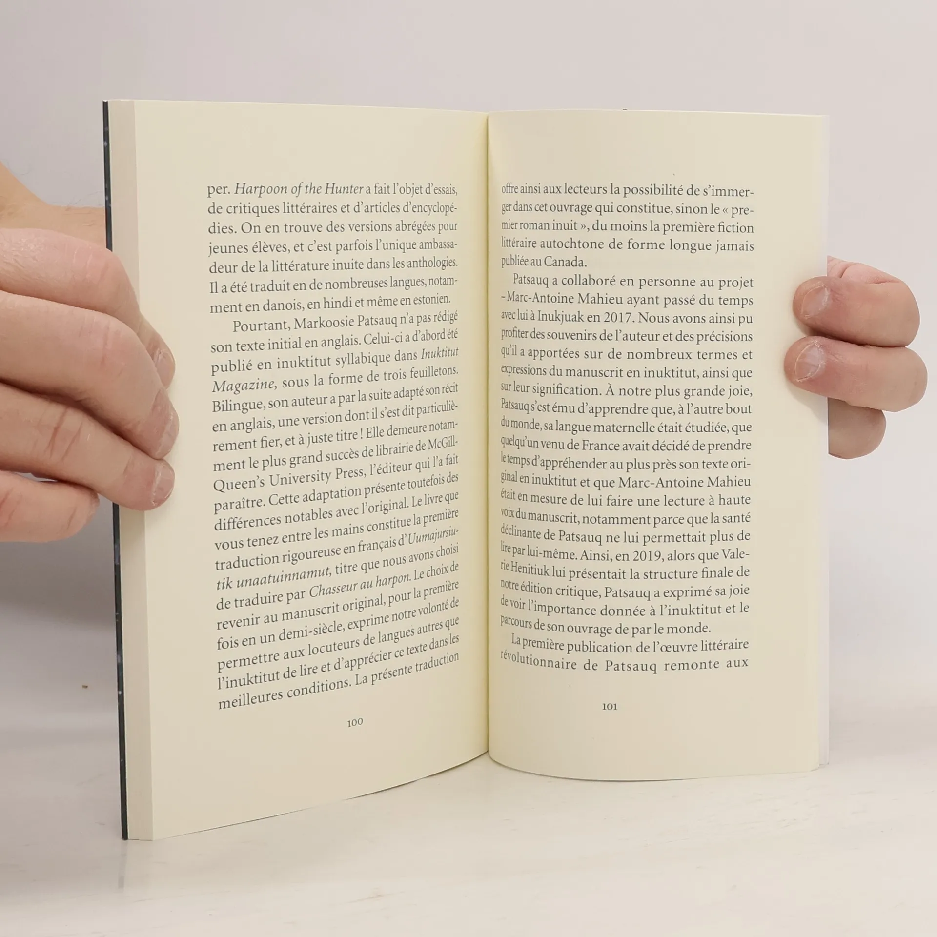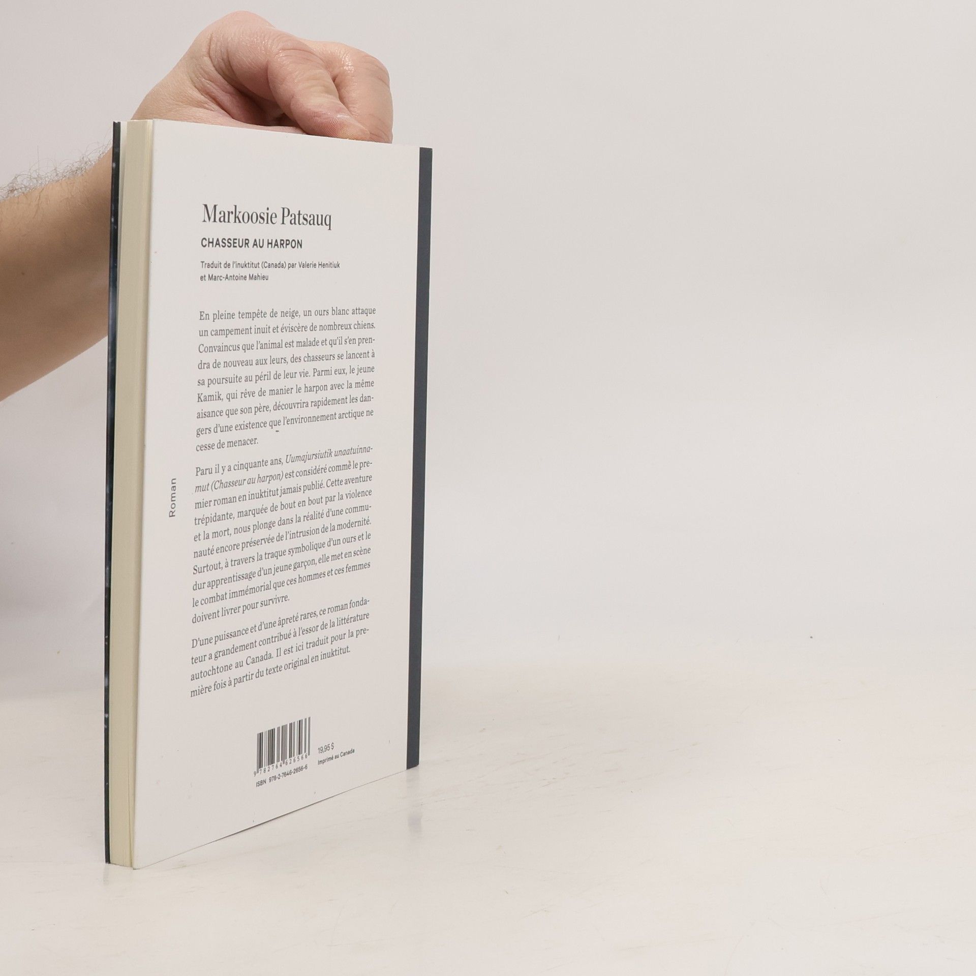 En pleine tempête de neige, un ours polaire attaque un campement inuit et éviscère de nombreux chiens. Convaincus que l'animal est malade et qu'il s'en prendra de nouveau aux leurs, des chasseurs se lancent à sa poursuite au péril de leur vie. Parmi eux, le jeune Kamik, qui rêve de manier le harpon avec la même aisance que son père, découvrira rapidement les dangers d'une existence que l'environnement arctique ne cesse de menacer.Paru il y a cinquante ans, Chasseur au harpon est considéré comme le premier roman en inuktitut jamais publié. Dans ce livre qui a grandement contribué à l'essor de la littérature autochtone au Canada, Markoosie Patsauq plonge dans la réalité d'une communauté encore préservée de l'intrusion de la modernité où la coopération et la vigilance sont les seuls gages de survie. Surtout, à travers la traque symbolique d'un ours et le dur apprentissage d'un jeune garçon, il met en scène le combat immémorial que ces hommes et cesfemmes doivent livrer pour survivre.