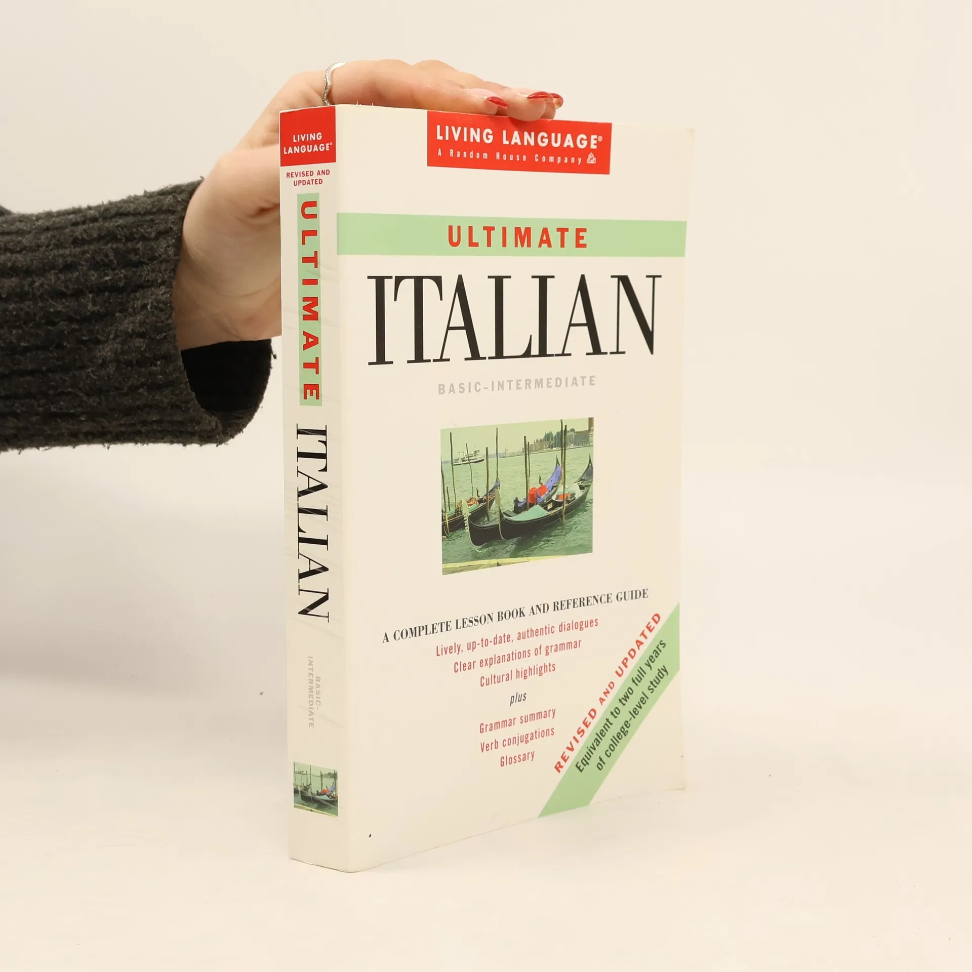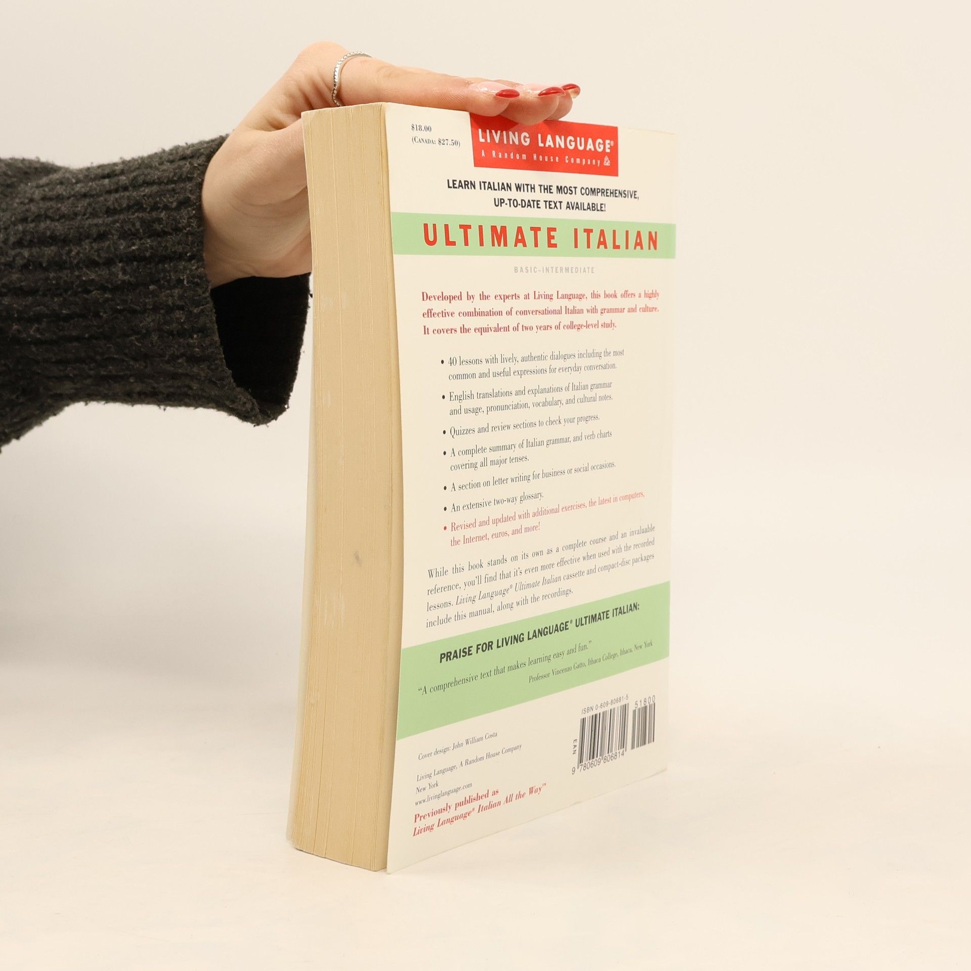 Learn Italian with the most comprehensive, up-to-date text available!Developed by the experts at Living Language, this book offers a highly effective combination of conversational Italian with grammar and culture. It covers the equivalent of two years of college-level study.Contents Include :40 lessons with lively, authentic dialogues including the most common and useful expressions for everyday conversation.English translations and explanations of Italian grammar and usage, pronunciation, vocabulary, and cultural notes.Quizzes and review sections to check your progress.A complete summary of Italian grammar, and verb charts covering all major tenses.A section on letter writing for business or social occasions.An extensive two-way glossary.Revised and updated with additional exercises, the latest in computers, the Internet, euros, and more!While this book stands on its own as a complete course and an invaluable reference, you'll find that it's even more effective when used with the recorded lessons. Living Language Ultimate Italian cassette and compact-disc packages include this manual, along with the recordings.