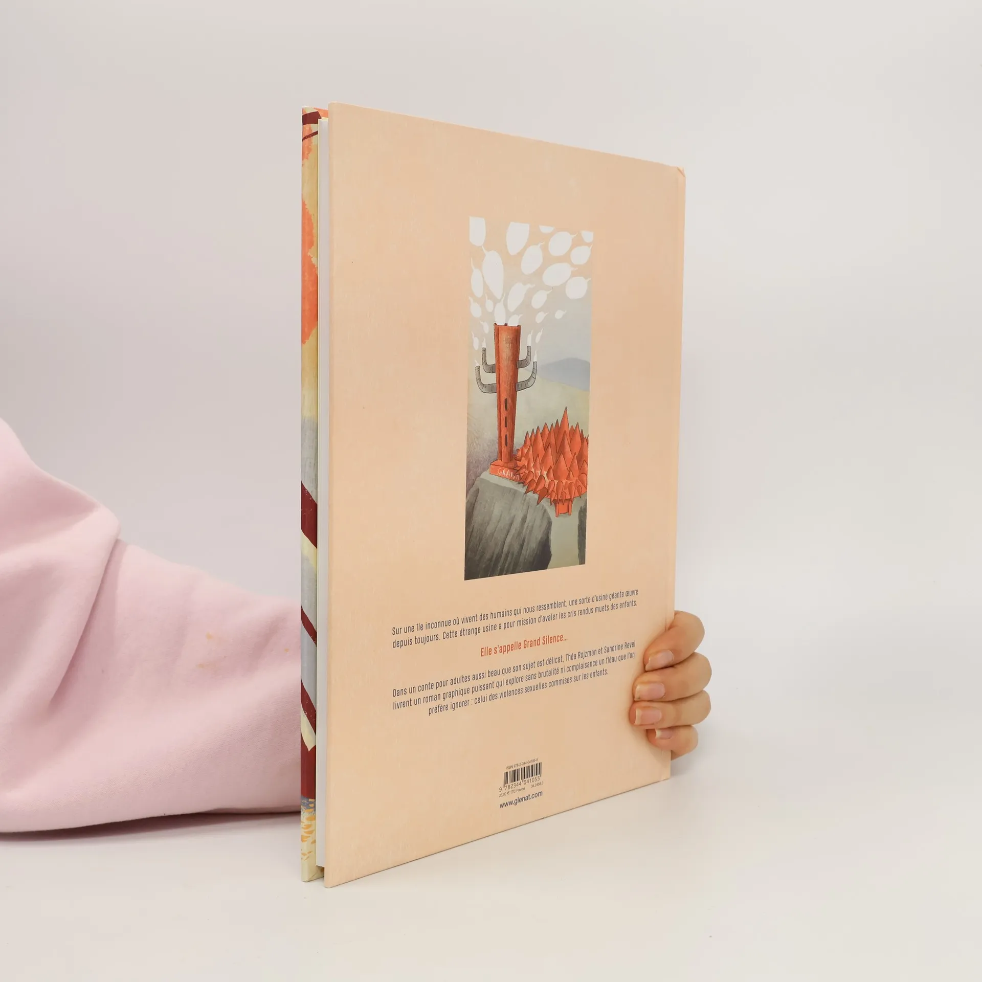 Sur une île inconnue où vivent des humains qui nous ressemblent, une sorte d'usine géante œuvre depuis toujours. Cette étrange usine a pour mission d'avaler les cris rendus muets des enfants.Elle s'appelle Grand Silence...Dans un conte pour adultes aussi beau que son sujet est délicat, Théa Rojzman et Sandrine Revel livrent un roman graphique puissant qui explore sans brutalité ni complaisance un fléau que l'on préfère ignorer : celui des violences sexuelles commises sur les enfants.