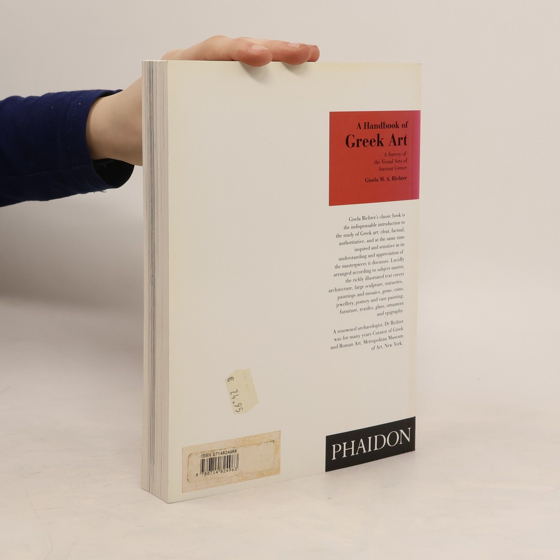 Gisela Richter's classic book, first published in 1959, is the indispensable introduction to the study of Greek clear, factual, authoritative, and at the same time inspired and sensitive in its understanding and appreciation of the masterpieces it discusses. Lucidly arranged according to subject matter, the richly illustrated text covers architecture, large sculptures, statuettes, paintings and mosaics, gems, coins, jewellery, pottery and vase painting, furniture, textiles, glass, ornament and epigraphy. A companion volume, A Handbook of Roman Art , is available from Phaidon.