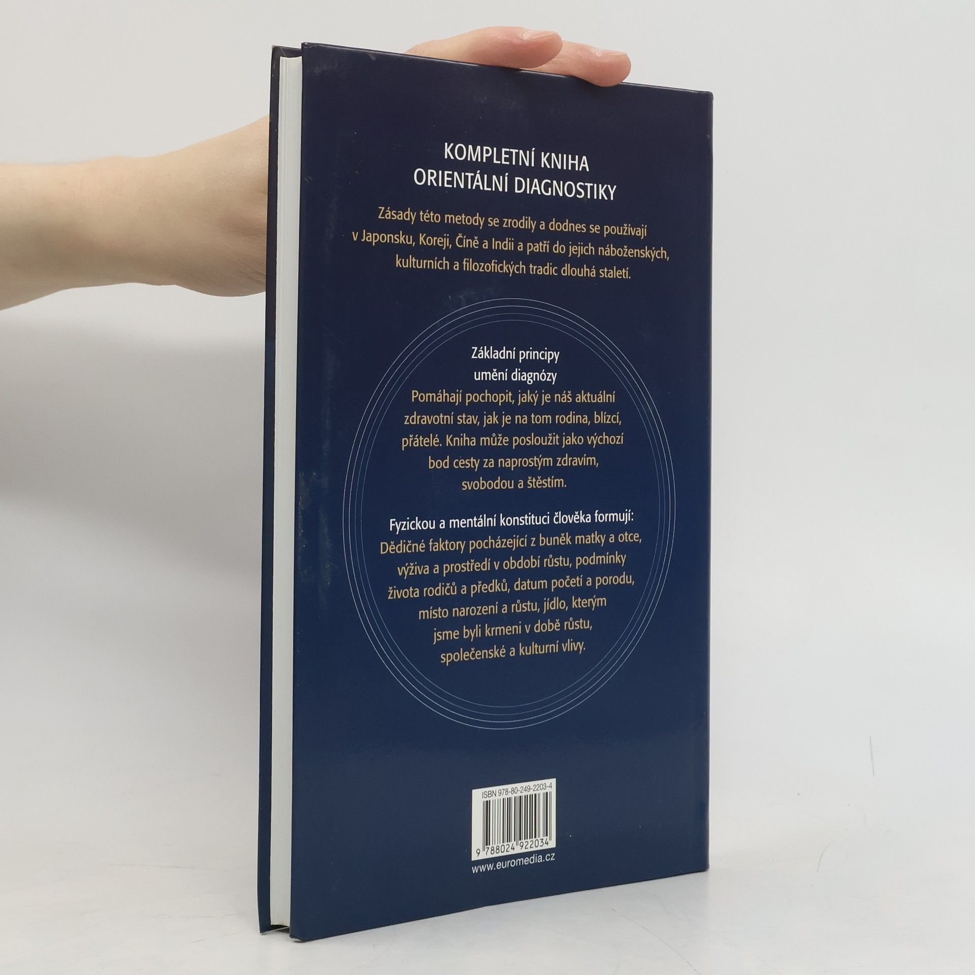 Tělo nám všechno prozradí, tělo nikdy nelže. Naučíte se umění diagnózy, metodu používanou dodnes v téměř celé Asii – jak dotykem, pohledem a tlakem poznat z tělesné konstituce, tvaru hlavy, posazení očí, velikosti dlaně, tvaru prstů zdravotní problémy. Kompletní kniha orientální diagnostiky pomáhá pochopit, jaký je náš aktuální zdravotní stav, jak je na tom rodina, blízcí, přátelé. Kniha může posloužit jako výchozí bod cesty za naprostým zdravím, svobodou a štěstím.