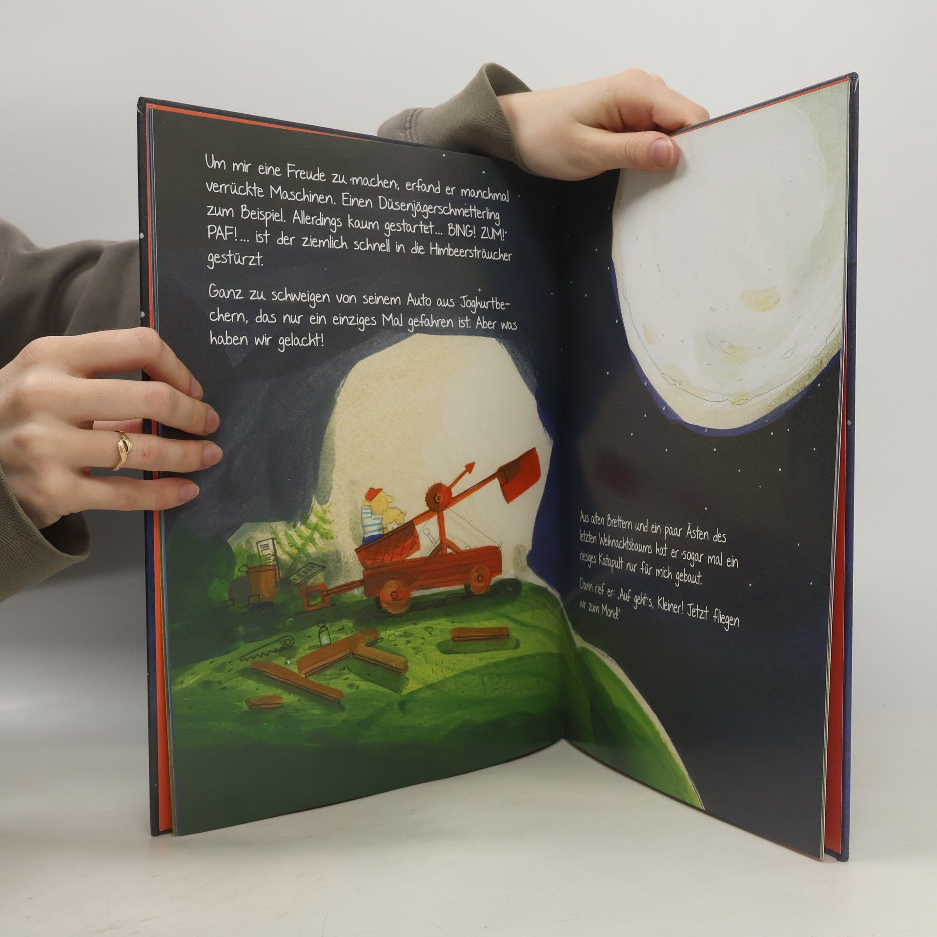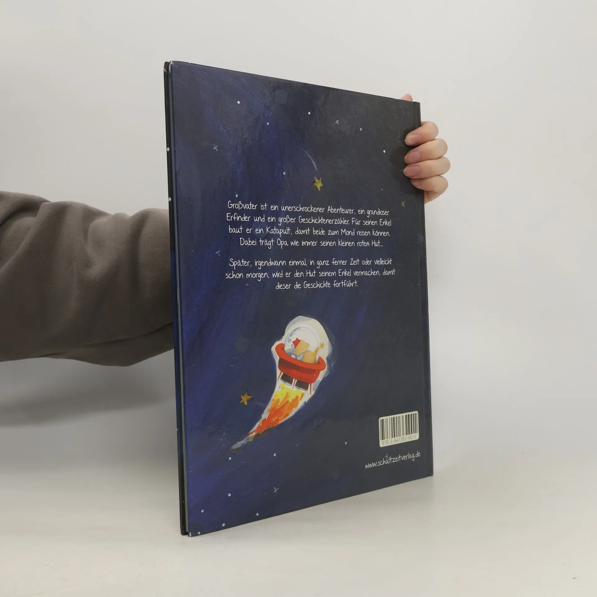 Großvater ist ein unerschrockener Abenteurer, ein grandioser Erfinder und ein großer Geschichtenerzähler. Für seinen Enkel baut er sogar ein Katapult, damit beide ihre lang geplante Mondreise antreten können. Dabei trägt Opa wie immer seinen kleinen roten Hut. - Später, irgendwann einmal, nach seinem Tod, in ganz ferner Zeit oder vielleicht schon morgen, wird er den Hut seinem Enkel vererben, damit dieser die Geschichte fortführen kann. Das verspricht er dem Kind. Als Opa auf der Rückfahrt von der Mondreise langsam müde wird, und die Zeit kommt voneinander Abschied zu nehmen, übergibt er das Steuer und seinen roten Hut an seinen Enkel. Er übergibt damit auch seinen gesammelten Erfahrungsschatz an seinen Enkel. Für diesen wird es nun Zeit die Welt mutig allein zu entdecken, mit der Erinnerung und dem Andenken an seinen Opa und ihre gemeinsamen Erlebnisse immer im Herzen. Wie soll man Kindern den Tod erklären? Dieses Kinderbuch bereitet Kinder behutsam auf eine Zeit ohne die Großeltern, nach ihrem Tod, vor und kann sehr gut dabei helfen Kindern den Tod zu erklären und diesen zu verarbeiten. Als Beilage ist in dem Buch zusätzlich ein rotes Faltblatt enthalten und eine Anleitung, wie man sich den Hut des Großvaters nachbasteln kann. Genre: Kinderbuch Tod - Abschied nehmen - Kindern den Tod erklären - Mondreise