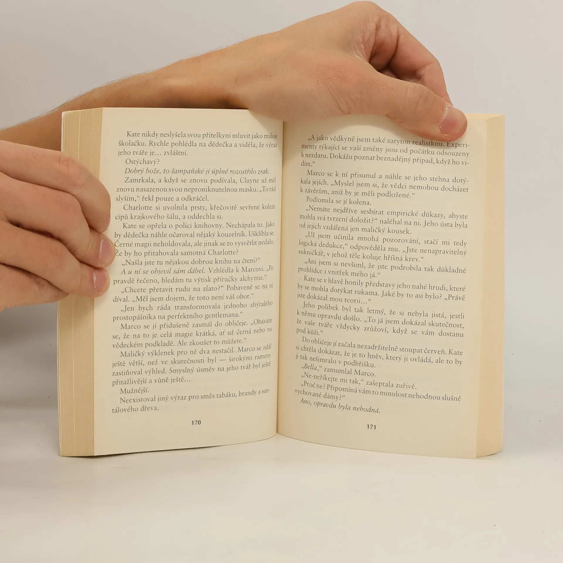 Kate se pod přísným dohledem svého dědečka, vévody z Cluyne, a v londýnské společnosti necítí dobře. Vše jí připadá příliš povrchní. Útěchu nalézá v přátelství podobně smýšlejících žen, jež si říkají Hříšnice a věnují se - ó, hrůza! - vědě. Kate přesto oceňuje dědečkovu starostlivost, a proto souhlasí, že se zúčastní velké slavnosti na jeho panství... Hříšně krásný, prostopášný, arogantní a naprosto nemožný hrabě Marco Ghiradelli je jako špion londýnské vlády vyslán na zámek vévody z Cluyne, kde se koná velká sešlost. Na panství je zavražděn jeden z významných hostů. Nůž zabodnutý do jeho těla patří krásné Kate, k níž je hrabě od začátku silně přitahován. Její nesmírná krása, inteligence i ostrý jazýček, a v neposlední řadě také parfém Marcovi kohosi připomíná... Připomíná mu něco, co se kdysi odehrálo v Itálii. Kate by nejraději na celý svůj předchozí život zapomněla - rozhodně by ve vybrané společnosti vyvolal skandál. Marcovi však paměť slouží výborně...