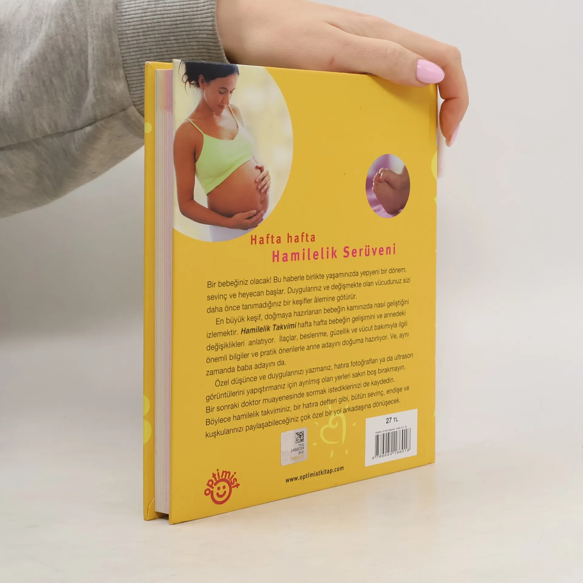 Bir bebeğiniz olacak! Bu haberle birlikte yaşamınızda yepyeni bir dönem, sevinç ve heyecan başlar. Duygularınız ve değişmekte olan vücudunuz sizi daha önce tanımadığınız bir keşifler âlemine götürür. En büyük keşif, doğmaya hazırlanan bebeğin karnınızda nasıl geliştiğini izlemektir. Hamilelik Takvimi hafta hafta bebeğin gelişimini ve annedeki değişiklikleri anlatıyor. İlaçlar, beslenme, güzellik ve vücut bakımıyla ilgili önemli bilgiler ve pratik önerilerle anne adayını doğuma hazırlıyor. Ve, aynı zamanda baba adayını da. Özel düşünce ve duygularınızı yazmanız, hatıra fotoğrafları ya da ultrason görüntülerini yapıştırmanız için ayrılmış olan yerleri sakın boş bırakmayın. Bir sonraki doktor muayenesinde sormak istediklerinizi de kaydedin. Böylece hamilelik takviminiz, bir hatıra defteri gibi, bütün sevinç, endişe ve kuşkularınızı paylaşabileceğiniz çok özel bir yol arkadaşına dönüşecek. Annette Nolden yaklaşık 10 yıldır kaleme aldığı sağlık, beslenme ve yaşam desteği konularındaki kitaplarıyla ünlenmiş bir yazar. Kendisi 36 yaşındayken (yazar 1963 doğumlu) geçirdiği hamilelik esnasında büyük heyecanlar yaşamış ve yanlış tanı nedeniyle acılar çekmiş. Başka kadınların aynı şeyleri yaşamaması ve hamileliğin tadını çıkarması için de bu kitabı yazmış.