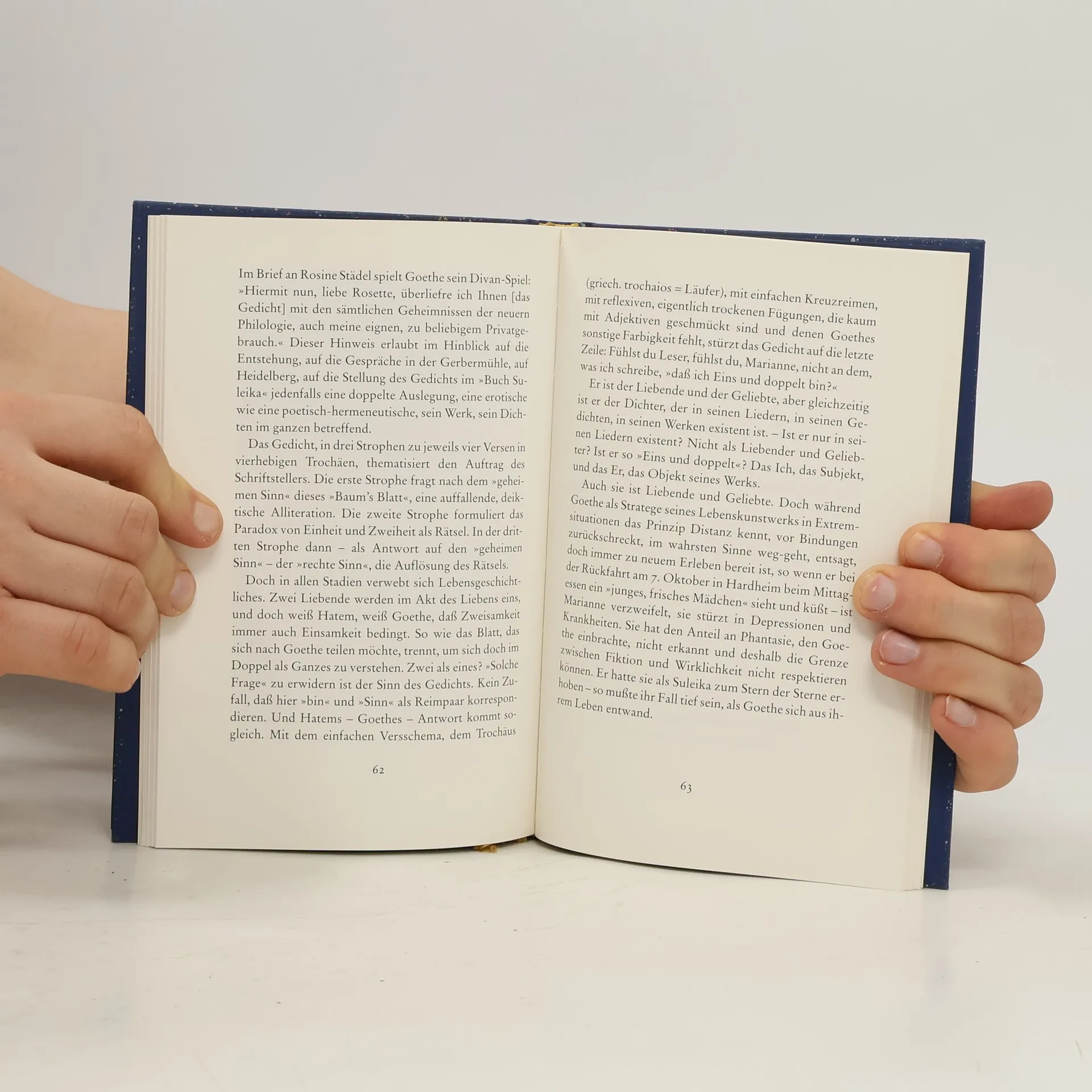 Im September 1815 hatte Goethe Marianne von Willemer ein Ginkgo-Blatt überreicht und dessen gefächerte Form für seine Existenz als Mensch und Dichter gedeutet: "... daß ich Eins und doppelt bin ...". Danach entwirft Goethe sein Gedicht "Gingo biloba" als Symbol von Vereinigung und Trennung. Siegfried Unseld beschreibt die Entstehungsgeschichte des "West-östlichen Divan". "Goethe und der Ginkgo erzählt, mit hinreißender Empathie, eine der schönsten komplizierten Liebesgeschichten. Eine wunderschöne, leichtfüßige Studie ..."