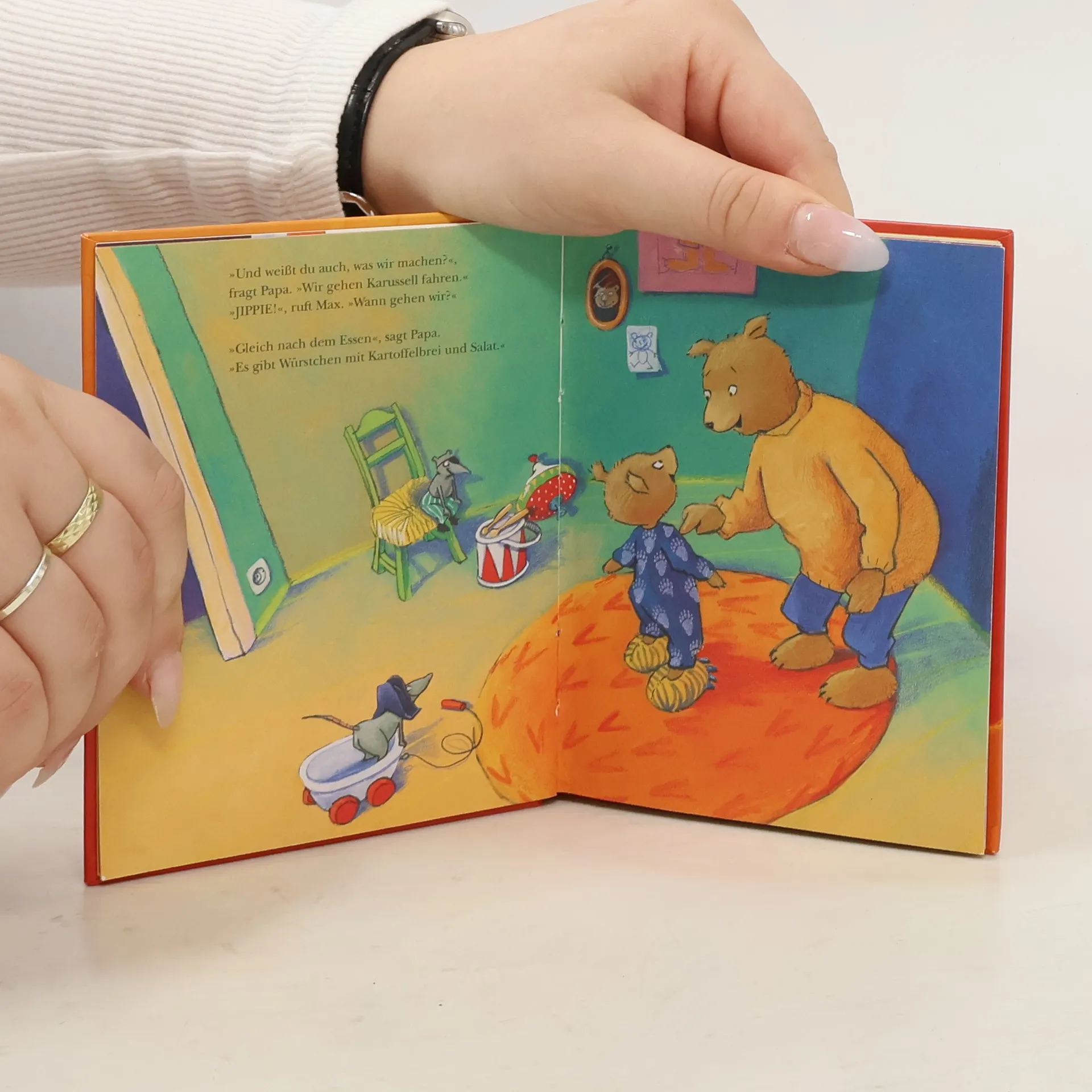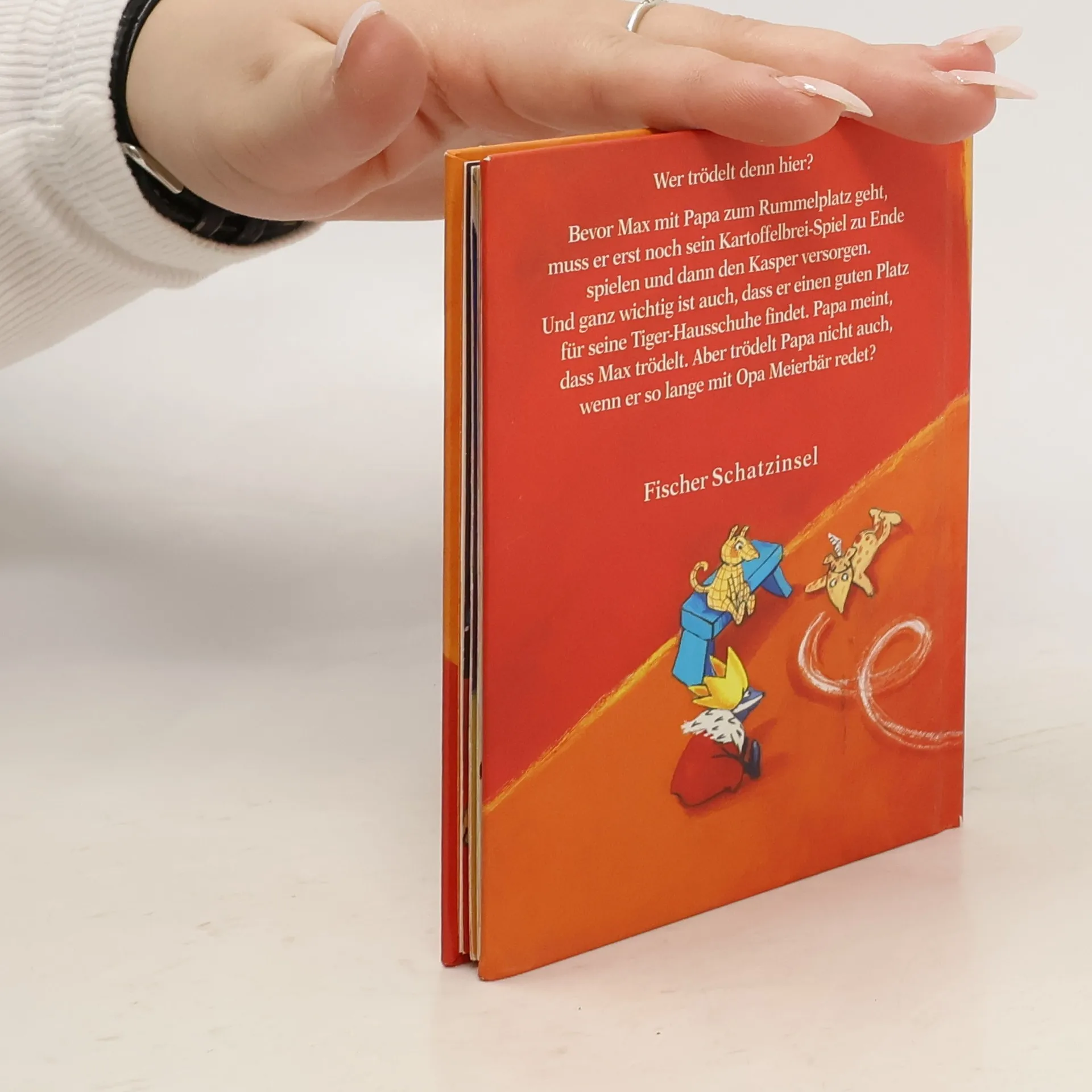 Bevor Max mit Papa zum Rummelplatz geht, muss er erst noch sein Kartoffelbrei-Spiel zu Ende spielen und dann den Kasper versorgen. Und ganz wichtig ist auch noch, dass er einen guten Platz für seine Tiger-Hausschuhe findet. Papa meint, dass Max trödelt. Und Papa, trödelt der nicht auch, wenn er so lange mit Opa Meierbär redet?!