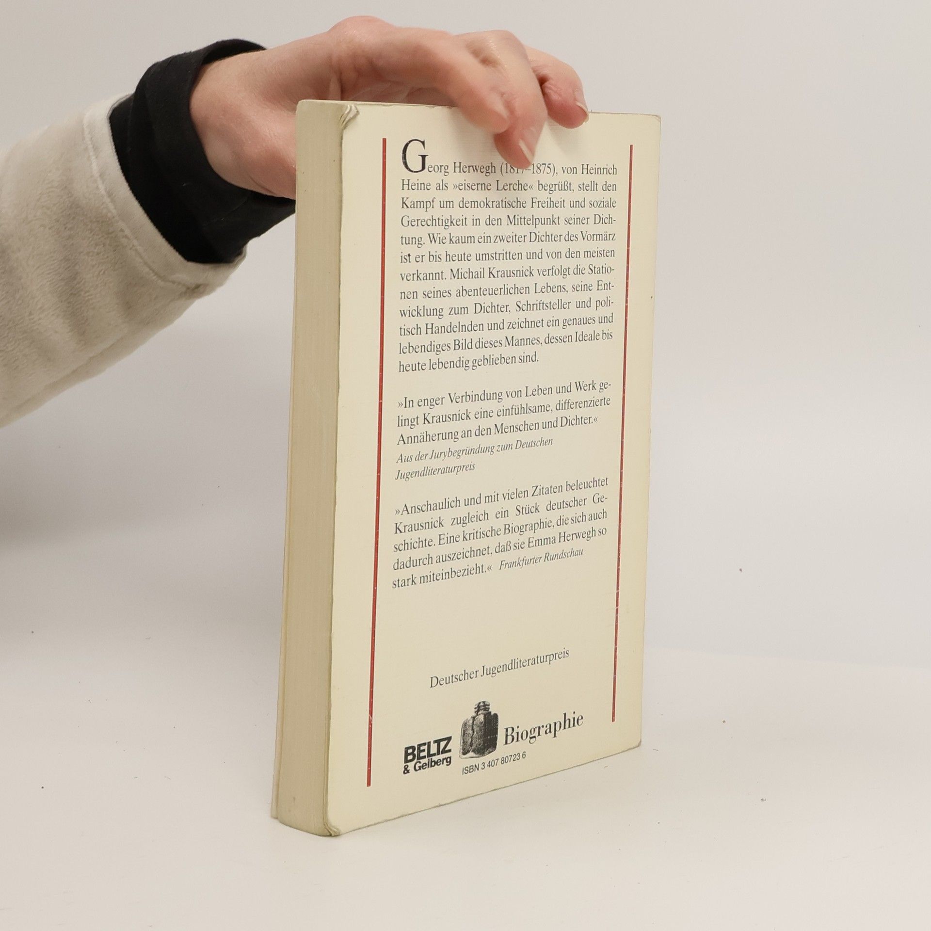 Krausnick, Michail Die eiserne Lerche. Die Lebensgeschichte des Georg Herwegh. Biographie, Weinheim (u.a.), Beltz & Gelberg, 1993, 21 cm, 206 S., Ill., graph. Darst., kart., Buch sehr gut erhalten, Einband leicht berieben, geringe Gebrauchsspuren RW 8 R 5, B