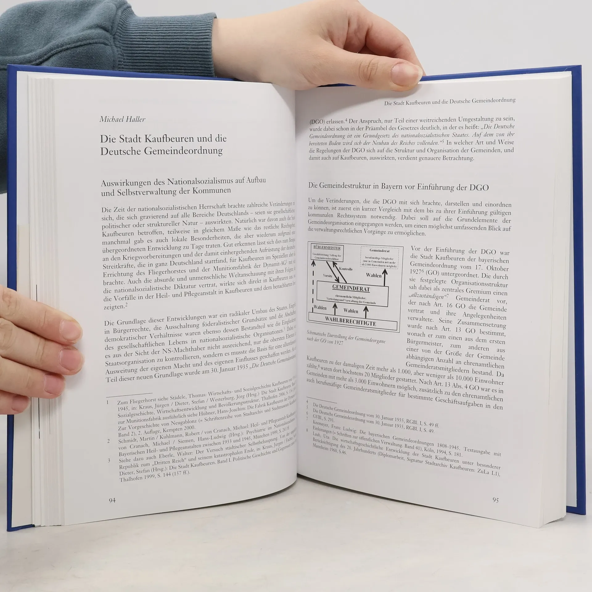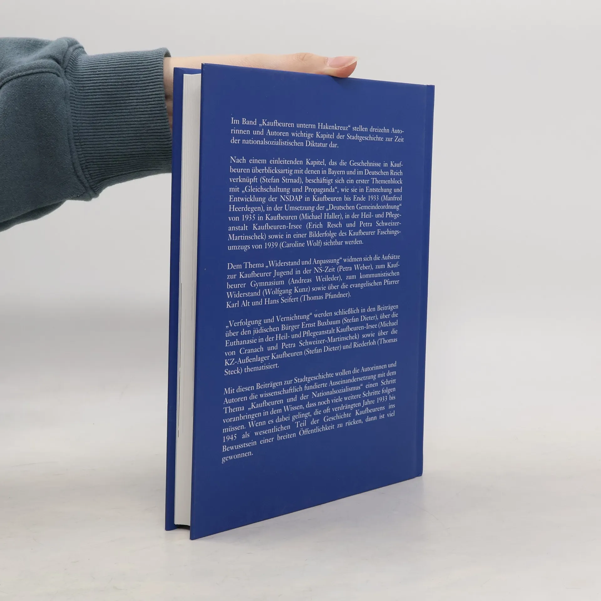 Nach einem einleitenden Kapitel, das die Geschehnisse in Kaufbeuren mit denen in Bayern und im Deutschen Reich verknüpft, behandelt der erste Themenblock „Gleichschaltung und Propaganda“. Hier wird die Entstehung und Entwicklung der NSDAP in Kaufbeuren bis Ende 1933, die Umsetzung der „Deutschen Gemeindeordnung“ von 1935, die Heil- und Pflegeanstalt Kaufbeuren-Irsee sowie der Kaufbeurer Faschingsumzug von 1939 thematisiert. Im zweiten Themenblock „Widerstand und Anpassung“ werden die Kaufbeurer Jugend in der NS-Zeit, das Kaufbeurer Gymnasium, der kommunistische Widerstand und die evangelischen Pfarrer Karl Alt und Hans Seifert behandelt. Der letzte Block widmet sich „Verfolgung und Vernichtung“ und beleuchtet den jüdischen Bürger Ernst Buxbaum, die Euthanasie in der Heil- und Pflegeanstalt sowie die KZ-Außenlager Kaufbeuren und Riederloh. Die Autorinnen und Autoren möchten mit diesen Beiträgen die wissenschaftliche Auseinandersetzung mit dem Thema „Kaufbeuren und der Nationalsozialismus“ voranbringen, im Bewusstsein, dass noch viele Schritte folgen müssen. Ziel ist es, die oft verdrängten Jahre 1933 bis 1945 als wesentlichen Teil der Geschichte Kaufbeurens ins öffentliche Bewusstsein zu rücken.