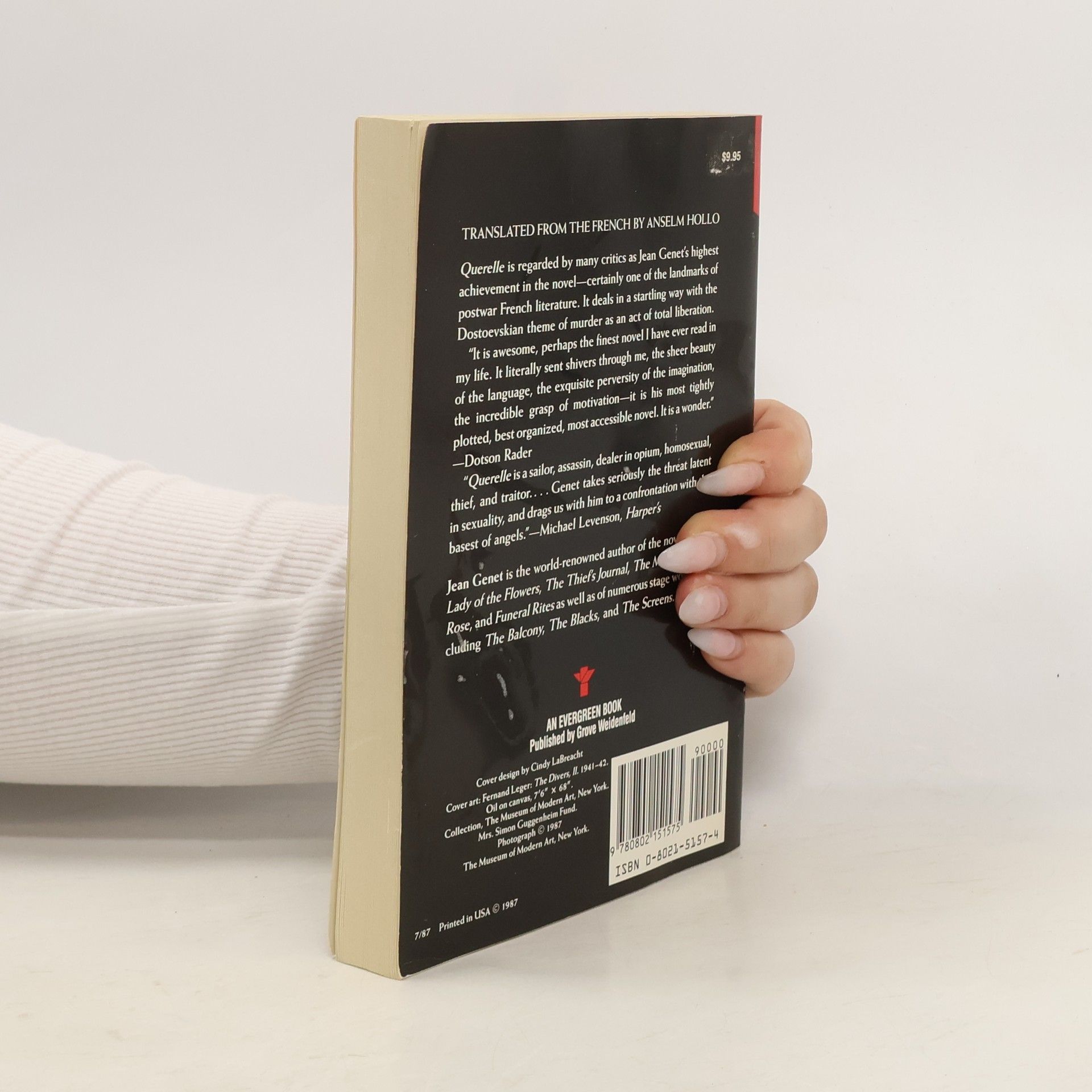 Querelle of Brest was first published anonymously in 1947 and limited to 460 numbered copies. It is set in the midst of the port town of Brest, where sailors and the sea are associated with murder. Its protagonist, Georges Querelle, is a bisexual thief, prostitute, and serial killer who manipulates and kills his lovers for thrills and profit. The novel formed the basis for Rainer Werner Fassbinder's last film, Querelle (1982)