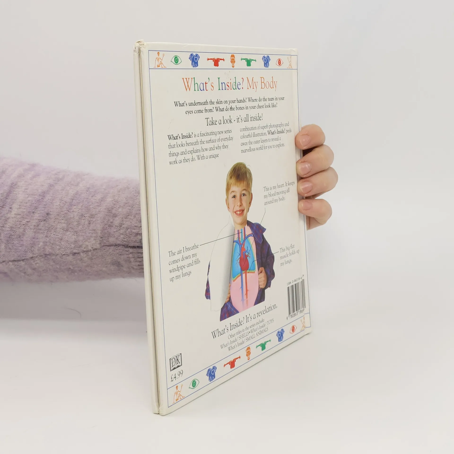 "What's Inside" is a new series that looks at how different things work. The series combines realistic photography and simple illustrations to demonstrate the inner workings of all sorts of everyday objects. This particular book looks inside the human body, using a "peel-back" illustration technique to help the child become involved in the use of the book. Other books in this series look at "Toys", "Small Animals" and "Shells".
