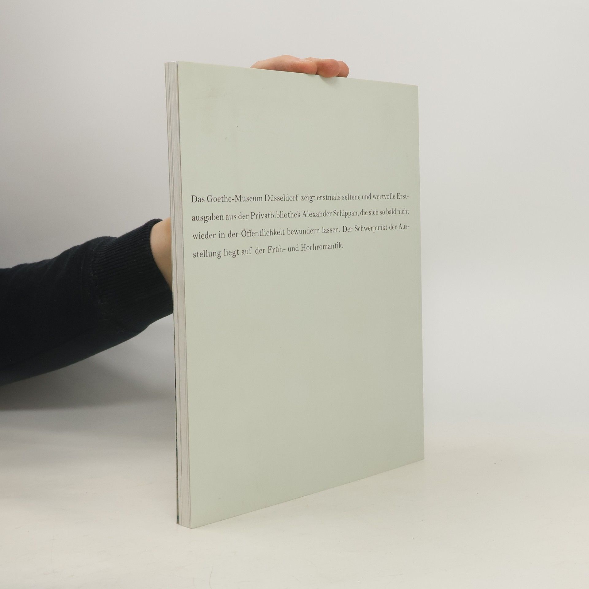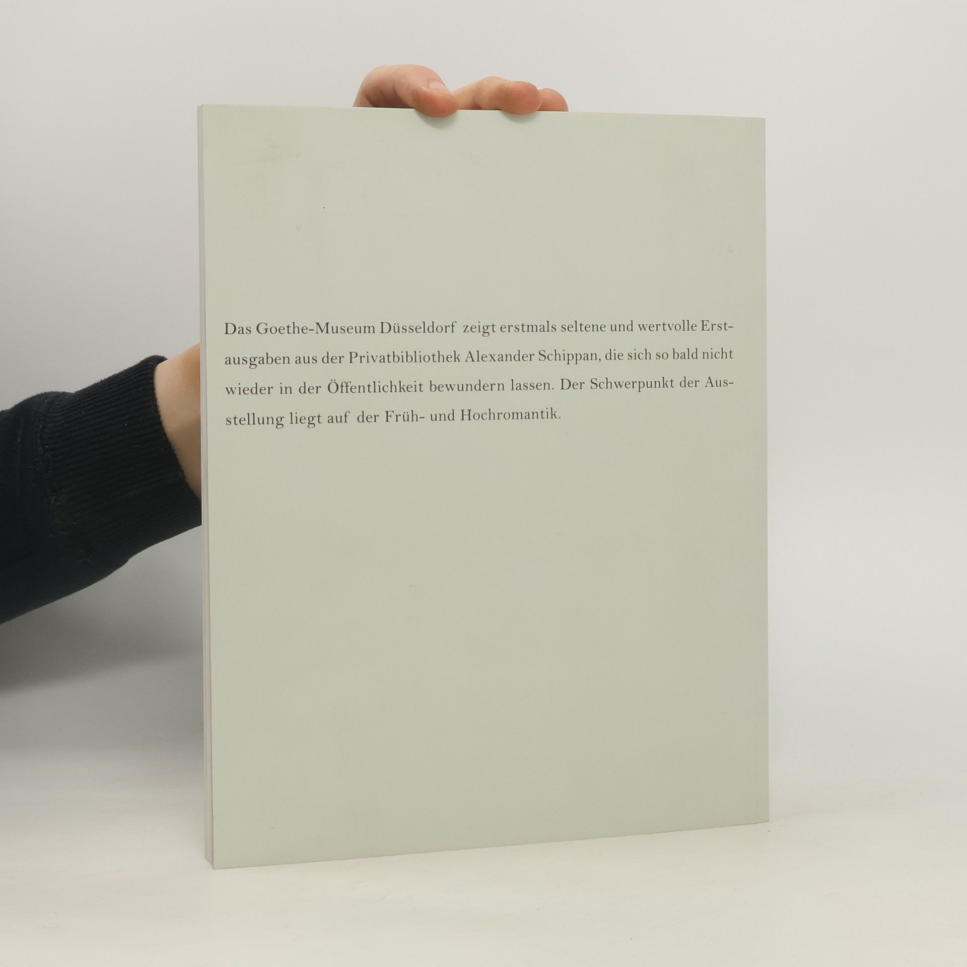 Die Ausstellung, der dieser Katalog gewidmet ist, lässt die Bücherwelt der Romantik wiederauferstehen. Sie präsentiert erstmals fünfzig wertvolle Erstdrucke aus der bedeutenden Privatsammlung Alexander Schippan. Das Schwergewicht liegt auf der Früh- und Hochromantik. Die Schau widmet sich auch dem Buch als bibliophilem Gegenstand.