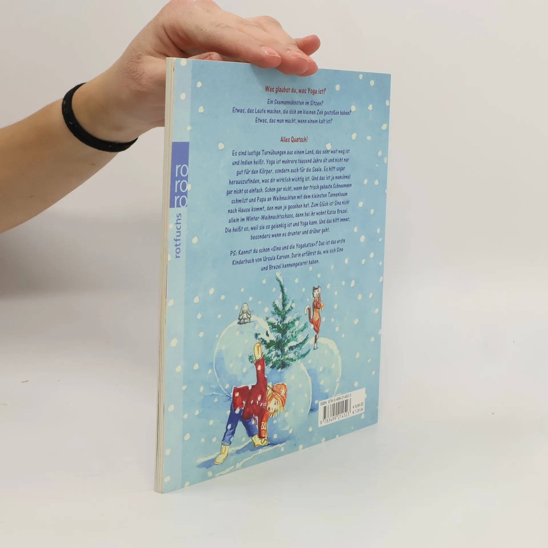 Was glaubst du, was Yoga ist? Ein Seemannsknoten im Sitzen? Etwas, das Leute machen, die sich am kleinen Zeh gestoßen haben? Etwas, das man macht, wenn einem kalt ist? Alles Quatsch! Es sind lustige Turnübungen aus einem Land, das sehr weit weg ist und Indien heißt. Yoga ist mehrere tausend Jahre alt und nicht nur gut für den Körper, sondern auch für die Seele. Es hilft sogar herauszufinden, was dir wirklich wichtig ist. Und das ist ja manchmal gar nicht so einfach. Schon gar nicht, wenn der frisch gebaute Schneemann schmilzt und Papa an Weihnachten mit dem kleinsten Tannenbaum nach Hause kommt, den man je gesehen hat. Zum Glück ist Sina nicht allein im Winter-Weihnachtschaos, denn bei ihr wohnt Katze Brezel. Die heißt so, weil sie so gelenkig ist und Yoga kann. Und das hilft immer, besonders wenn es drunter und drüber geht. PS: Kennst du schon «Sina und die Yogakatze»? Das ist das erste Kinderbuch von Ursula Karven. Darin erfährst du, wie sich Sina und Brezel kennengelernt haben.