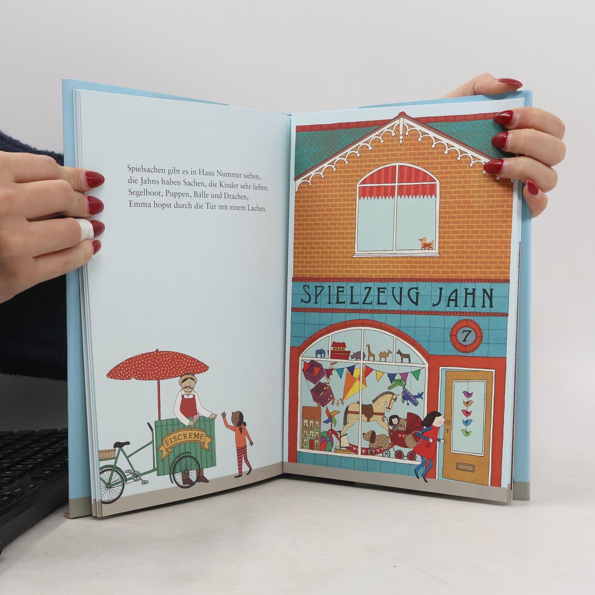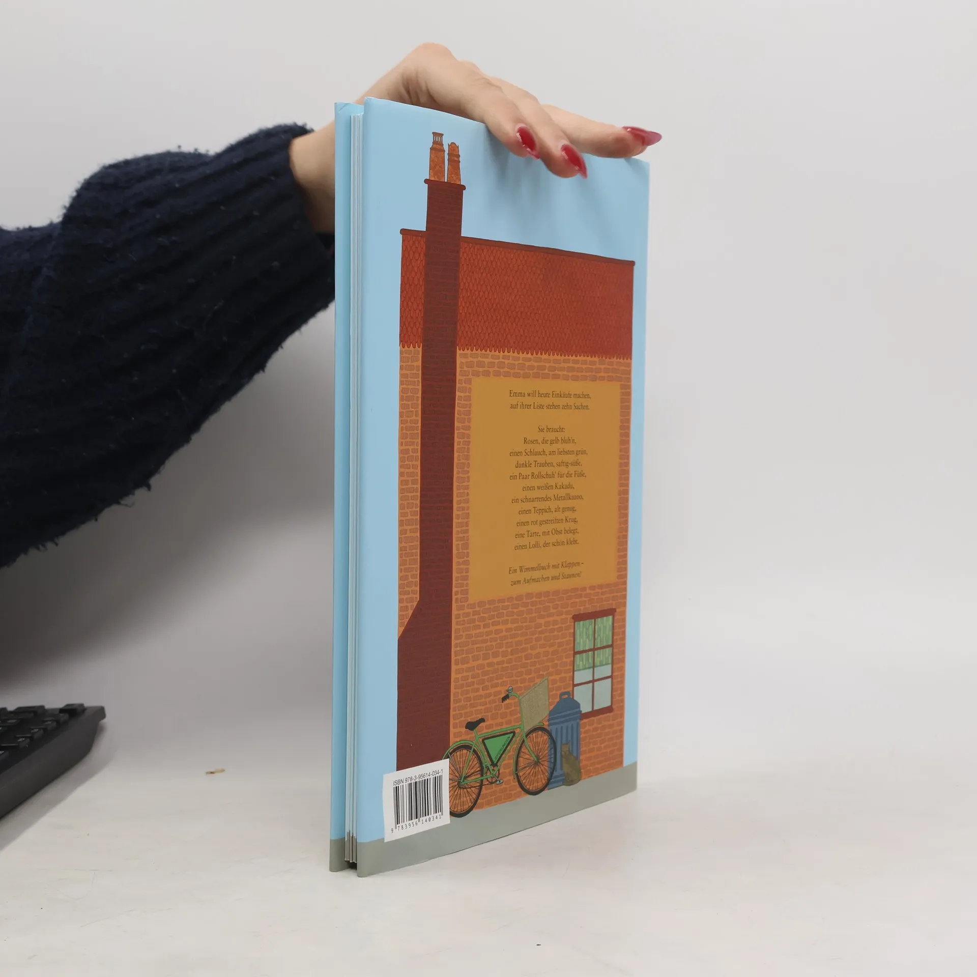 Zehn Sachen stehen auf Emmas ungewöhnlicher Einkaufsliste: eine gelbe Rose, ein Gartenschlauch, Weintrauben, Rollschuhe, ein Kakadu, eine Kazoo, ein Teppich, ein gestreifter Krug, ein Kirschtörtchen und ein herzförmiger Lutscher. Also geht Emma – nein, nicht ins Einkaufszentrum!, sondern in den kleinen Blumenladen und den Haushaltswarenhandel, in den Laden für Früchte und Gemüse und ins Spielzeuggeschäft, in die Tierhandlung und zum Musikalienhändler, in den Porzellanladen und zum Antiquitätenhändler, in die Konditorei – und natürlich ins Süßwarengeschäft. Jeder dieser wunderbaren Läden ist schon von außen eine Verheißung, und drinnen – nach dem Öffnen der Klappen des Buches – tun sich prachtvolle Welten auf. Emma bekommt tausend zauberhafte Dinge zu sehen, denn was stapelt sich nicht alles Leckeres, Nützliches, Wohlriechendes, Interessantes, Schönes und Besonderes in den Regalen? Und fast alles, was Emma gerne möchte, findet sie auch – bis auf eines … Man kann eben nicht alles kaufen! Gehalten von einer charmanten, gereimten Geschichte, entfaltet dieses sehr spezielle Wimmelbuch seinen ganz besonderen Reiz durch die detailreichen Illustrationen, die ganz heutig und nostalgisch zugleich wirken.