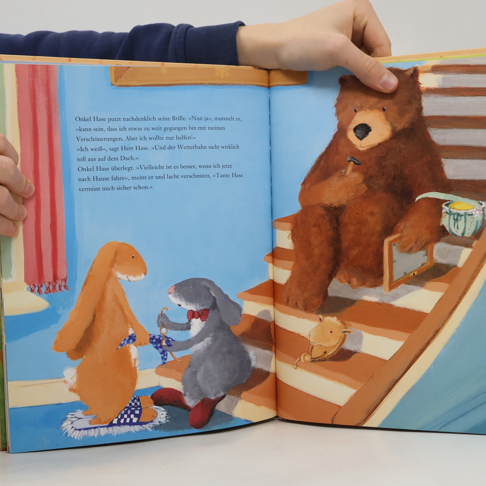 Herr Hase und Frau Bär bekommen Besuch! Onkel Hase trifft ein und stellt das Zusammenleben Wenn die Verwandtschaft kommt …der beiden ganz schön auf den Kopf. Da werden neue Tapeten an die Wände geklebt, Vorhängegenäht, sprich das ganze Haus nach Onkel Hases strikten Vorstellungen umdekoriert. Das passt Herrn Hase überhaupt nicht. Frau Bär hingegen ist sehr angetan vom charmanten Onkel. Was zu einem Eifersuchtsdrama und beinahe zu einem Zerwürfnis zwischen Herrn Hase und Frau Bär führt. Doch zum Glück kann das Schlimmste noch abgewendet werden. Onkel Hase zeigt sich am Ende einsichtig und merkt, dass all seine Verschönerungsaktionen zwar gut gemeint, aber doch ein bisschen zuviel des Guten waren. Und als Onkel Hase wieder abgereist ist, kehrt endlich Ruhe ein, ins kleine Haus am Waldrand.