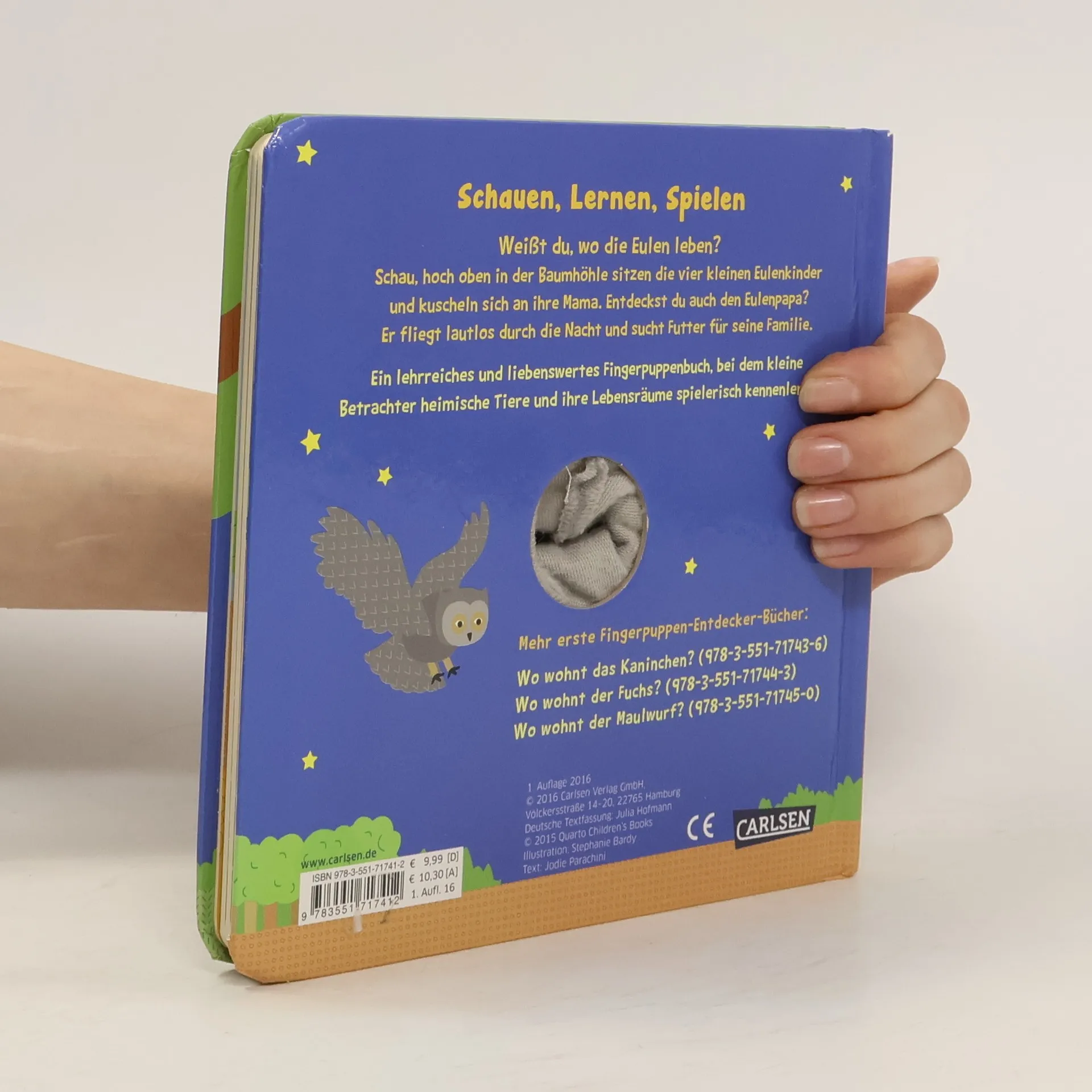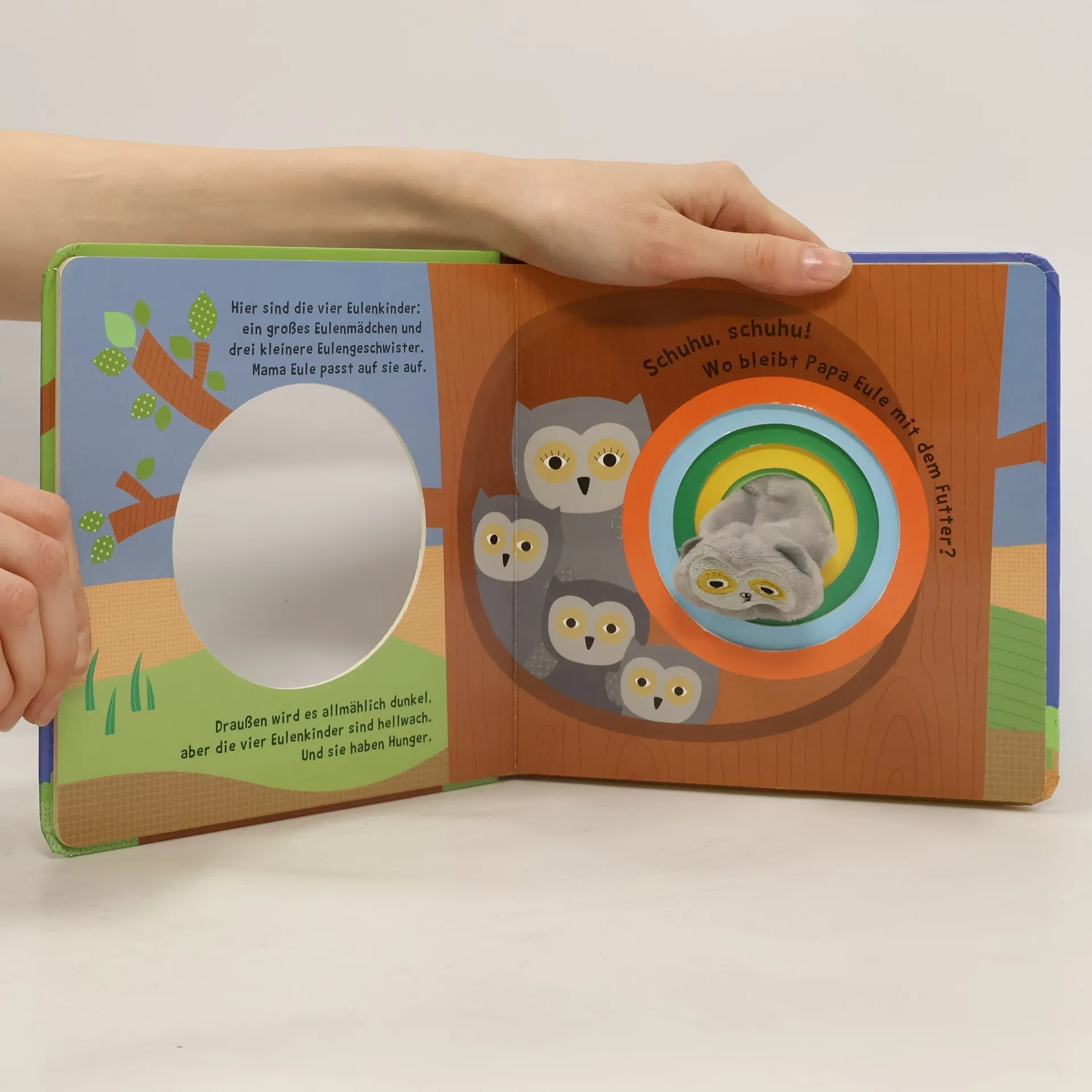 Schauen, lernen, spielen, hier erfahren kleine Tierfreunde, wo die Eulen leben. Hoch oben in der Baumhöhle sitzen die vier kleinen Eulenkinder und kuscheln sich an ihre Mama. Wer entdeckt auch den Eulenpapa? Ein lehrreiches und liebenswertes Fingerpuppenbuch, bei dem kleine Betrachter heimische Tiere und ihre Lebensräume spielerisch kennenlernen.