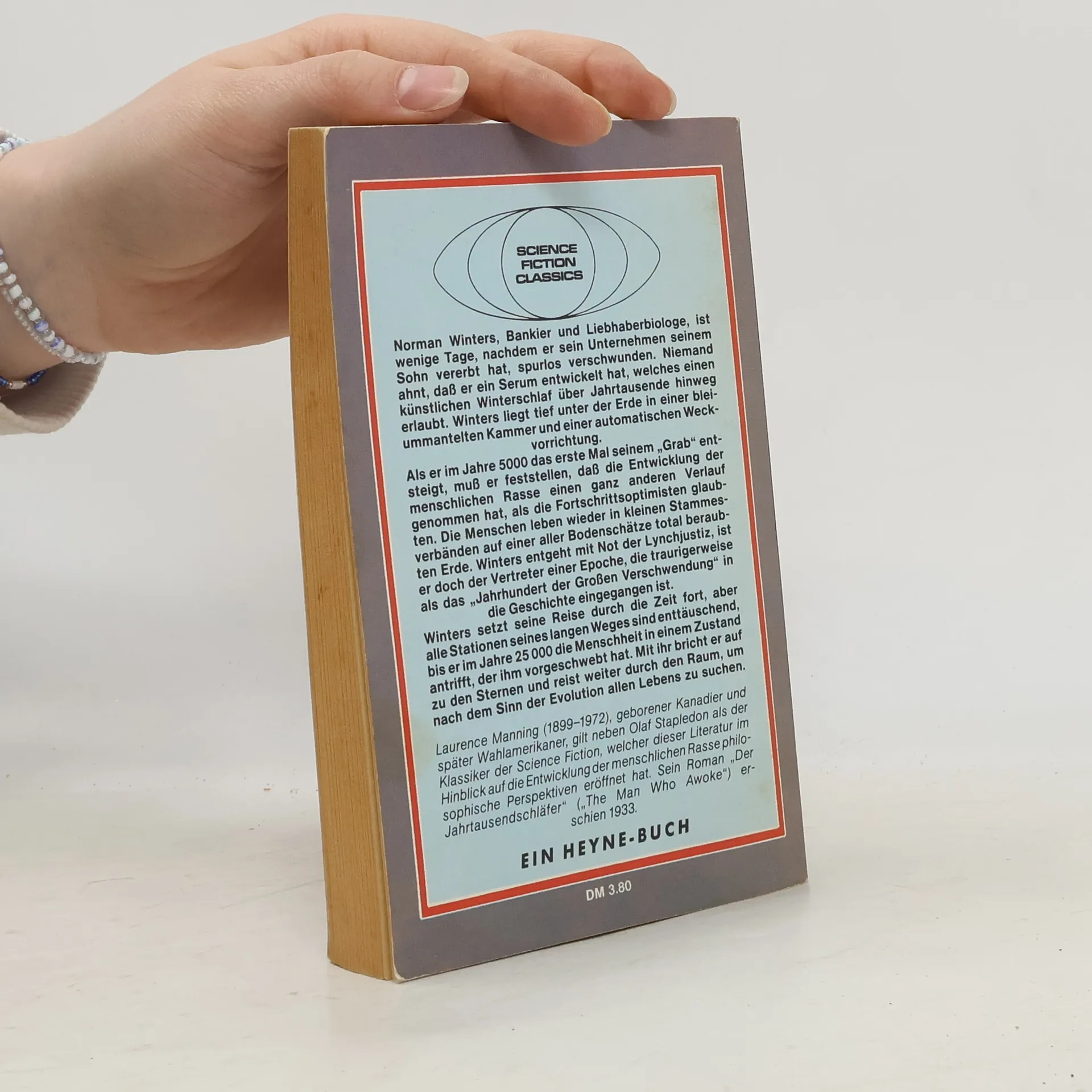 (Dieses Buch hat die ISBN 3453303954) Norman Winters, Bankier und Liebhaberbiologe, ist wenige Tage, nachdem er sein Unternehmen seinem Sohn vererbt hat, spurlos verschwunden. Niemand ahnt, dass er ein Serum entwickelt hat, welches einen künstlichen Winterschlaf über Jahrtausende hinweg erlaubt. Winters liegt tief unter der Erde in einer bleiummantelten Kammer und einer automatischen Weckvorrichtung. Als er im Jahre 5000 das erste Mal seinem "Grab" entsteigt, muss er feststellen, dass die Entwicklung der menschlichen Rasse einen ganz anderen Verlauf genommen hat, als die Fortschrittsoptimisten glaubten. Die Menschen leben wieder in kleinen Stammesverbänden auf einer aller Bodenschätze total beraubten Erde. Winters entgeht mit Not der Lynchjustiz, ist er doch der Vertreter einer Epoche, die traurigerweise als das "Jahrhundert der Großen Verschwendung" in die Geschichte eingegangen ist. Winters setzt seine Reise durch die Zeit fort, aber alle Stationen seines langen Weges sind enttäuschend, bis er im Jahre 25 000 die Menschheit in einem Zustand antrifft, der ihm vorgeschwebt hat. Mit ihr bricht er auf zu den Sternen und reist weiter durch den Raum, um nach dem Sinn der Evolution allen Lebens zu suchen.