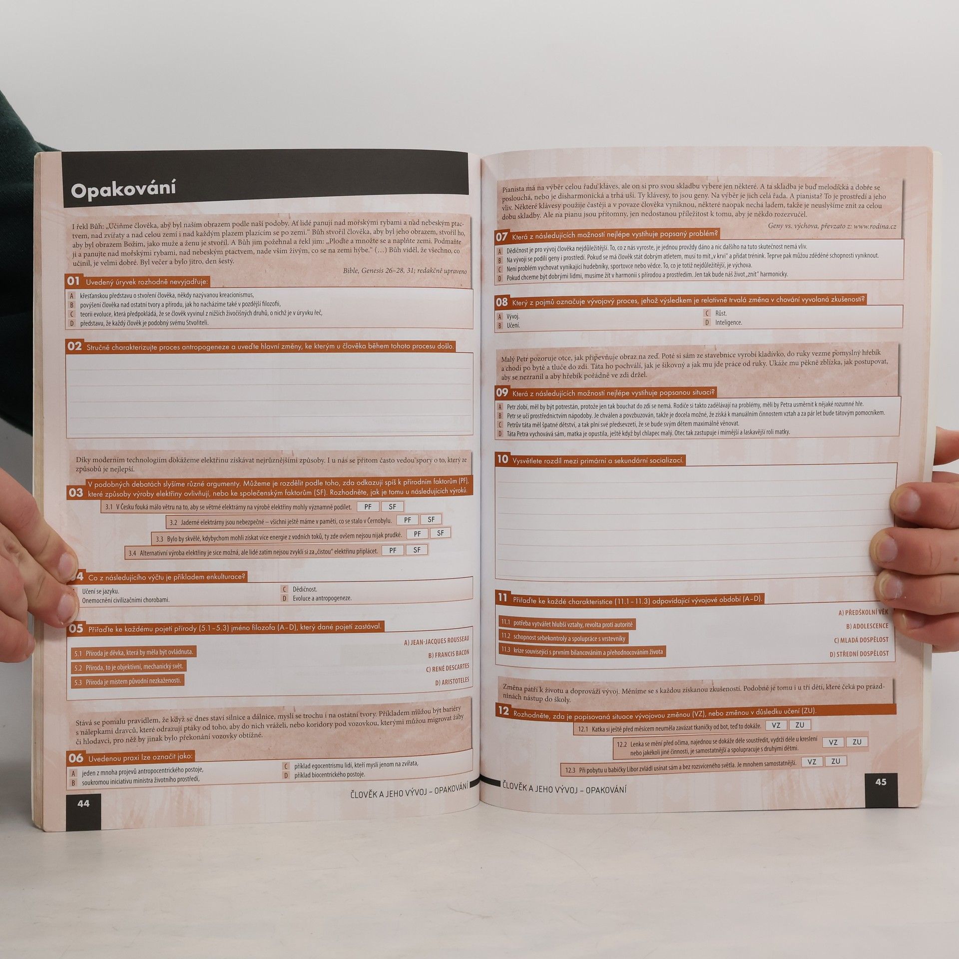Pracovní sešit je navržen jako jednotný celek s učebnicí, přičemž se předpokládá jejich kombinované využití ve výuce. Ověřuje a prohlubuje znalosti klíčového učiva a spojuje vybrané problematiky s každodenním životem. Cvičení podporují rozvoj dovedností a klíčových kompetencí žáků a splňují požadavky Rámcového vzdělávacího programu pro gymnaziální a střední odborné vzdělávání. Struktura sešitu odpovídá učebnici, obsahuje shodné tematické celky, kapitoly a podkapitoly, přičemž jednotlivá cvičení odkazují na výkladové části učebnice. Každý tematický celek zahrnuje dvoustránkové Opakování, které ověřuje znalost klíčových pojmů a problémů a je zpracováno podle typů cvičení, které odpovídají maturitní zkoušce. Sešit nabízí širokou škálu cvičení, včetně klasických faktografických úloh a aktivit zaměřených na práci s textem, posuzování modelových situací a identifikaci problémů. Zadání kombinují individuální, párovou a skupinovou práci, a zahrnují podněty pro dlouhodobější projekty. Důraz je kladen na spolupráci studentů a jejich sebevyjádření formou diskusí a písemných prací. Většinu cvičení mohou studenti vypracovat přímo do sešitu, což podporuje práci s různými informačními zdroji a kritické zhodnocení jejich spolehlivosti. Grafické zpracování zvyšuje přehlednost a systematičnost textů a formálně odlišuje typy cvičení a formy práce studentů.