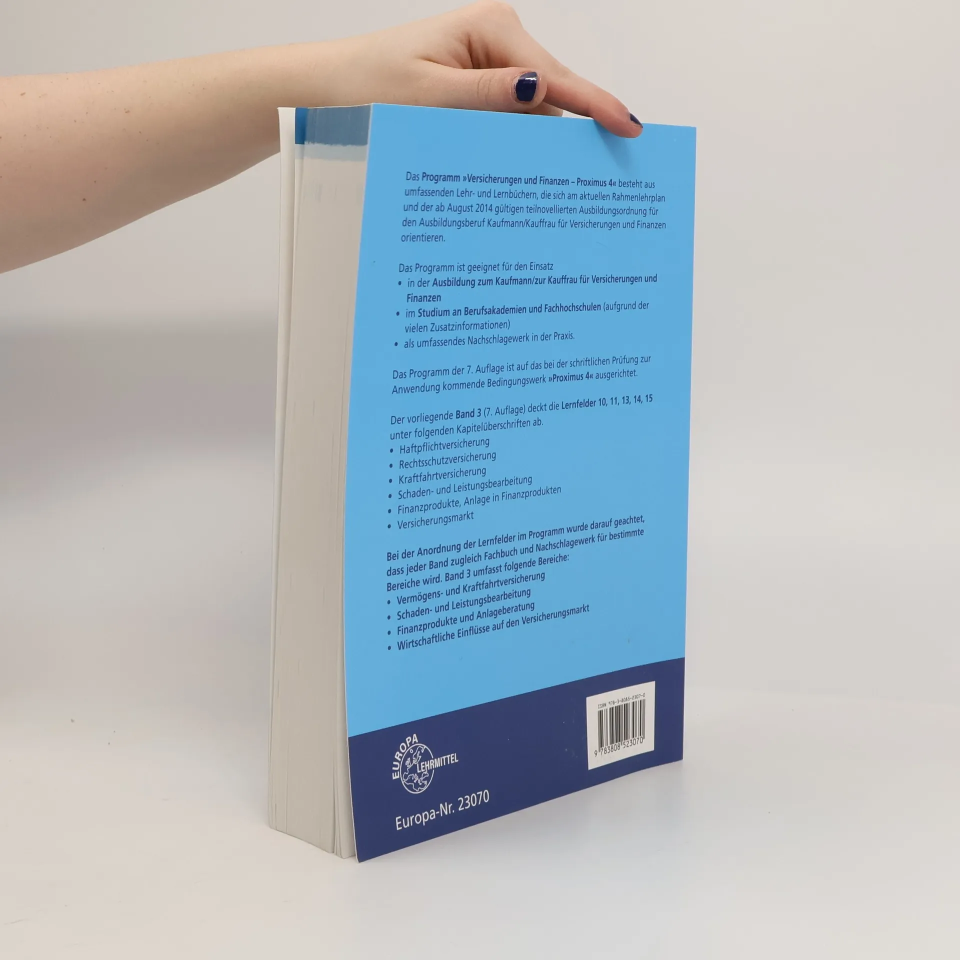Das Programm Versicherungen und Finanzen Proximus 4 umfasst umfassende Lehr- und Lernbücher, die sich am aktuellen Rahmenlehrplan und der Ausbildungsordnung für den Beruf Kaufmann/Kauffrau für Versicherungen und Finanzen orientieren. Die Reihe eignet sich für die Ausbildung, das Studium an Berufsakademien und Fachhochschulen sowie als Nachschlagewerk in der Praxis. Zu den Merkmalen gehören Lernsituationen am Ende jedes Hauptabschnitts, zusätzliche Aufgaben in den Lernfeldern, Hinweise auf Gesetze und Paragrafen am Rand des Textes, Zusatzinformationen im Kleindruck und ein Lernfeldkompass im vorderen Buchdeckel. Die 7. Auflage ist auf das vom Berufsbildungswerk der Versicherungswirtschaft herausgegebene Werk Proximus 4 Privatkunden Bedingungen und Tarife ausgerichtet. Band 3 behandelt Haftpflichtversicherung, Rechtsschutzversicherung, Kraftfahrtversicherung, Schaden- und Leistungsbearbeitung sowie Finanzprodukte. Neu in der 7. Auflage sind die vollständige Einarbeitung aller Neuerungen des Bedingungswerks und die Anpassung der Lerninhalte, Aufgaben und Lösungen. Die Lernfelder Schaden- und Leistungsbearbeitung sowie Anlage in Finanzprodukten wurden durch Beispielfälle erweitert, die sich an den Anforderungen der Abschlussprüfung orientieren. Änderungen der wirtschaftlichen Daten und gesetzlichen Rahmenbedingungen bis Ende Juli 2019 sind berücksichtigt.
