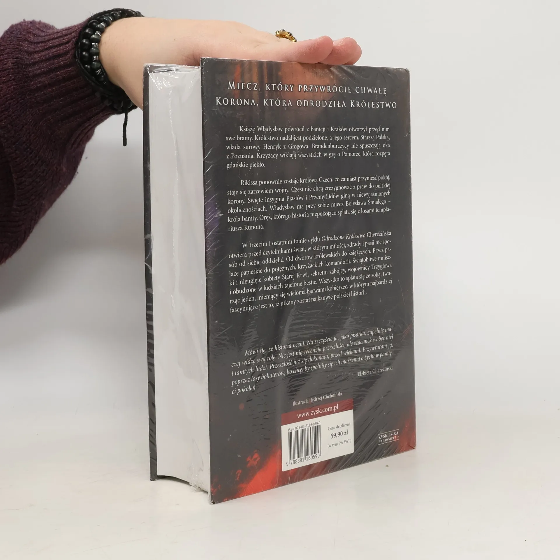 Książę Władysław powrócił z banicji i Kraków otworzył przed nim swe bramy. Ale Królestwo wciąż jest podzielone, w Starszej Polsce władają książęta Głogowa, w Czechach trwają zawirowania tronowe, a na północy Krzyżacy zaczynają swą grę o Pomorze. Grę, która rozpętała gdańskie piekło.Władysław znów musi walczyć z wrogami, którzy naciskają na niego ze zbyt wielu stron. Pokonać potężnego biskupa Muskatę, co zbuntował Małą Polskę przeciw prawowitemu władcy. I nagle, dzięki uporowi Małego Księcia, wszystkie pasma porażek zaczynają zamieniać się w drogi wiodące do celu – Odrodzonego Królestwa. Czy siła Władysława płynie tylko z jego charakteru, czy też dodaje mu jej miecz króla banity? Miecz, którego niezwykła historia wpleciona jest w dzieje Polski.W trzecim i ostatnim tomie trylogii „Odrodzone Królestwo” Elżbieta Cherezińska pokazuje znanych nam bohaterów – Władysława Łokietka i jego żonę Jadwigę, która wyrasta na Wawelską Panią, arcybiskupa Świnkę i jego następców, biskupa Muskatę i Rikissę, która ponownie zasiada na czeskim tronie. Kobiety Starej Krwi i Starcy Siwobrodzi wplątują się w wojnę, losy renegata templariuszy zaś, Kunona, niebezpiecznie splatają się z losem Królestwa. Płatni zabójcy, Guntersberg, Hunia i karzeł Grunhagen, znów nie próżnują.W finale niewidzialna korona zamienia się w prawdziwą, na skroniach nieugiętego księcia, Władysława Łokietka.