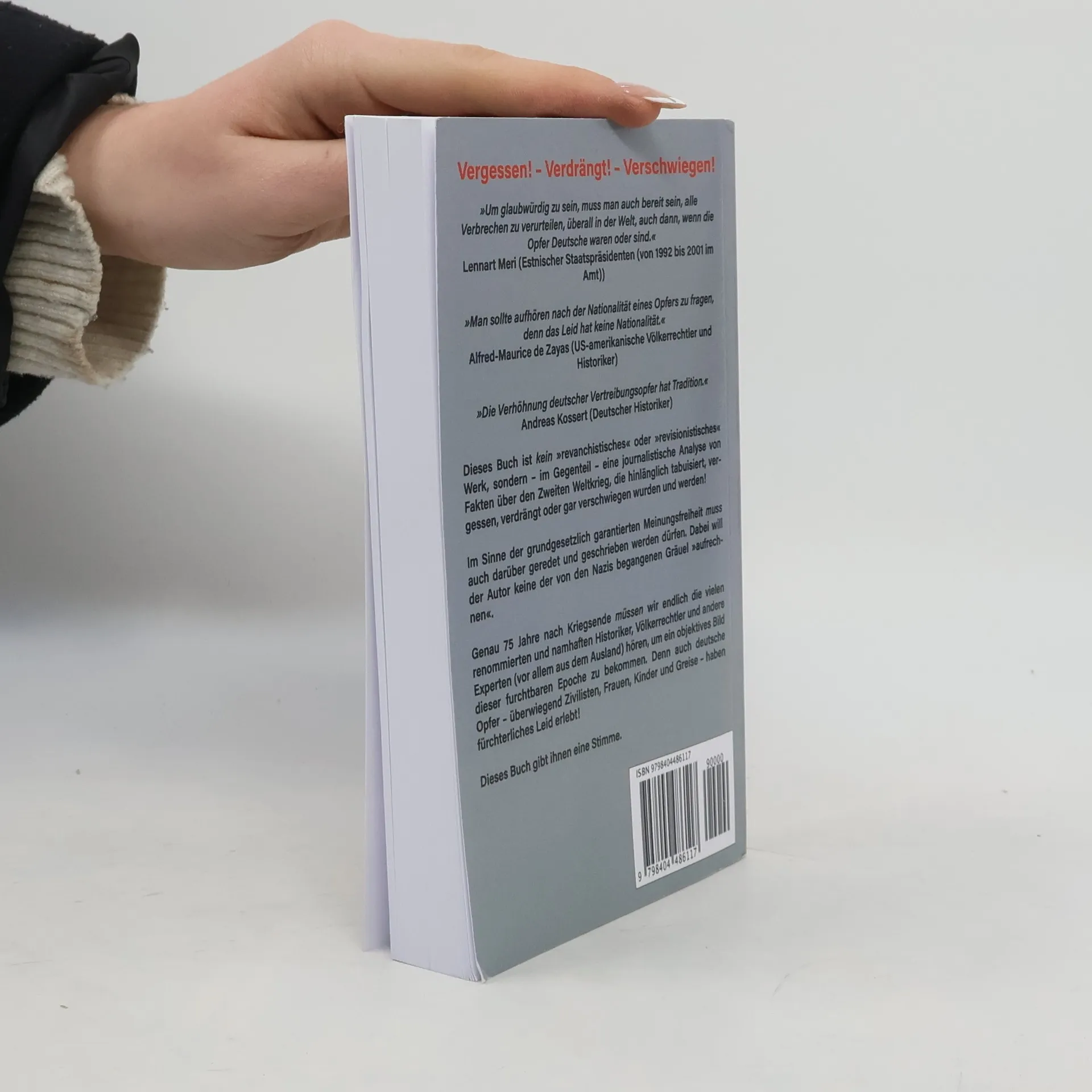Vergessen! - Verdrängt! - Verschwiegen! »Um glaubwürdig zu sein, muss man auch bereit sein, alle Verbrechen zu verurteilen, überall in der Welt, auch dann, wenn die Opfer Deutsche waren oder sind.« Lennart Meri (Estnischer Staatspräsidenten (von 1992 bis 2001 im Amt)) »Man sollte aufhören nach der Nationalität eines Opfers zu fragen, denn das Leid hat keine Nationalität.« Alfred-Maurice de Zayas (US-amerikanische Völkerrechtler und Historiker) »Die Verhöhnung deutscher Vertreibungsopfer hat Tradition.« Andreas Kossert (Deutscher Historiker) Dieses Buch ist kein „revanchistisches“ oder „revisionistisches“ Werk, sondern – im Gegenteil – eine journalistische Analyse von Fakten über den Zweiten Weltkrieg, die hinlänglich tabuisiert, vergessen, verdrängt oder gar verschwiegen wurden und werden! Im Sinne der grundgesetzlich garantierten Meinungsfreiheit muss auch darüber geredet und geschrieben werden dürfen. Dabei will der Autor keine der von den Nazis begangenen Gräuel „aufrechnen“. Genau 75 Jahre nach Kriegsende müssen wir endlich die vielen renommierten und namhaften Historiker, Völkerrechtler und andere Experten (vor allem aus dem Ausland) hören, um ein objektives Bild dieser furchtbaren Epoche zu bekommen. Denn auch deutsche Opfer – überwiegend Zivilisten, Frauen, Kinder und Greise – haben fürchterliches Leid erlebt! Dieses Buch gibt ihnen eine Stimme.