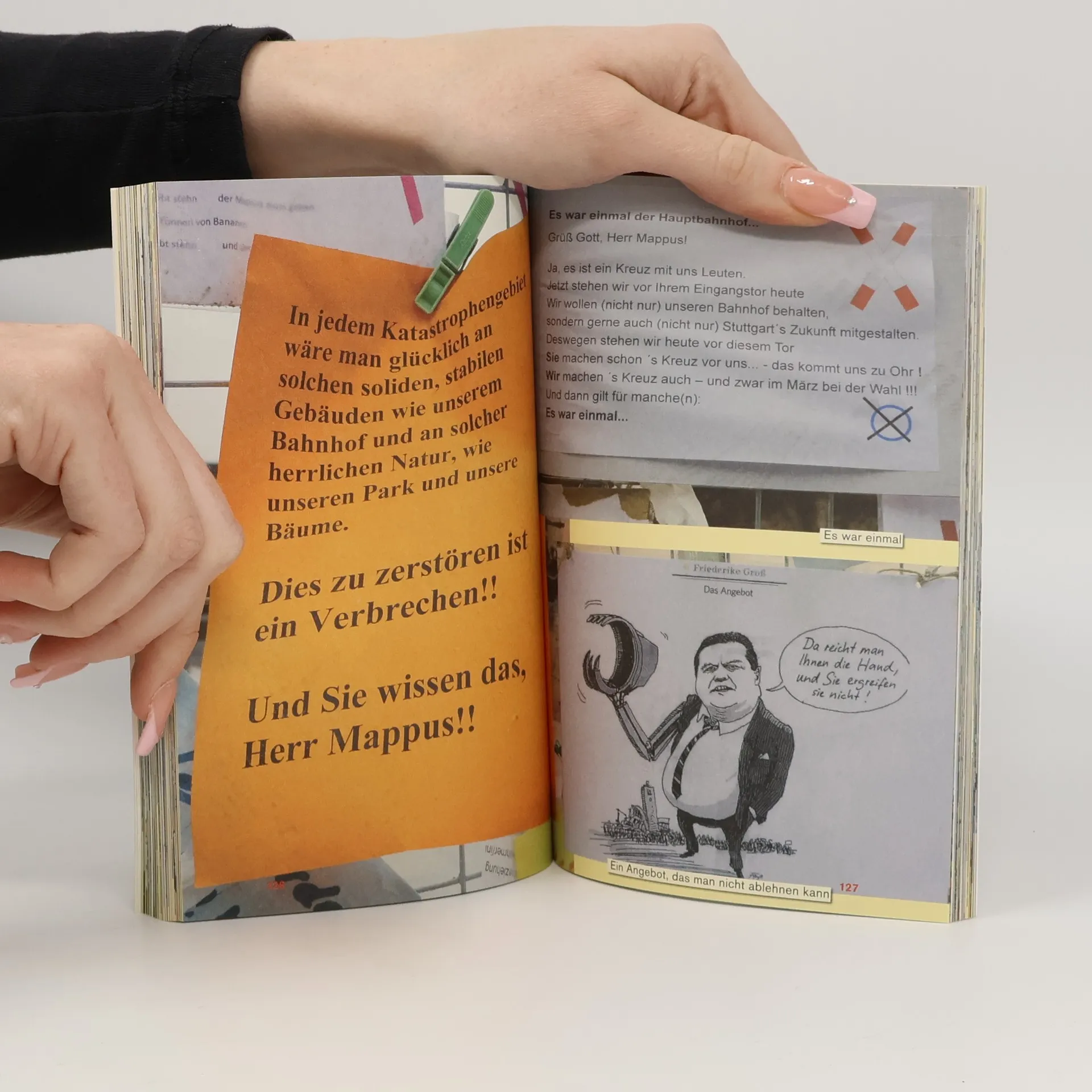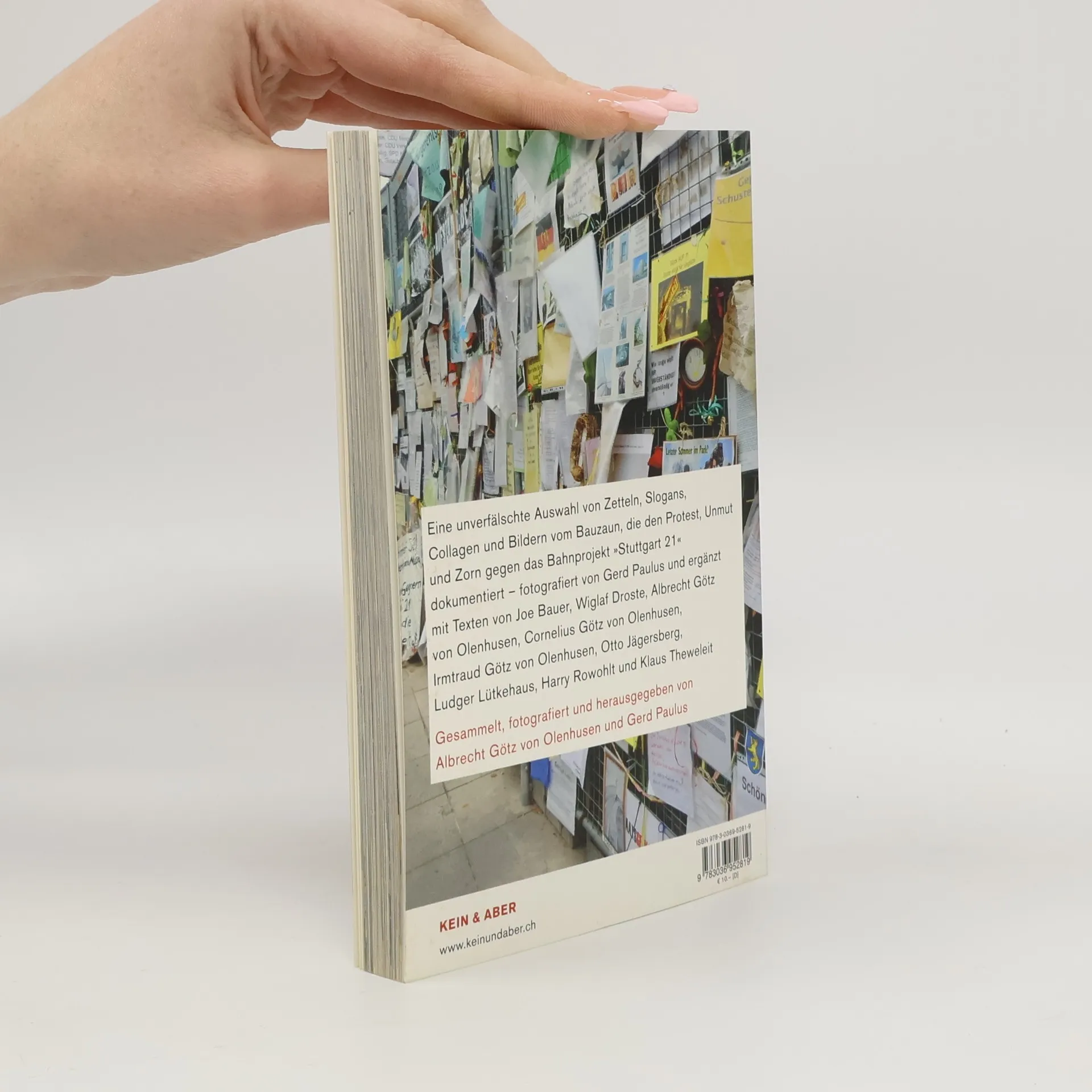 Eine unverfälschte Auswahl von Zetteln, Slogans, Collagen und Bildern vom Bauzaun, die den Protest, Unmut und Zorn gegen das Bahnprojekt „Stuttgart 21“ dokumentiert - fotografiert von Gerd Paulus und ergänzt mit Texten von Joe Bauer, Wiglaf Droste, Otto Jägersberg, Ludger Lütkehaus, Harry Rowohlt, Klaus Theweleit u. a. Gesammelt, fotografiert und herausgegeben von Albrecht Götz von Olenhusen und Gerd Paulus