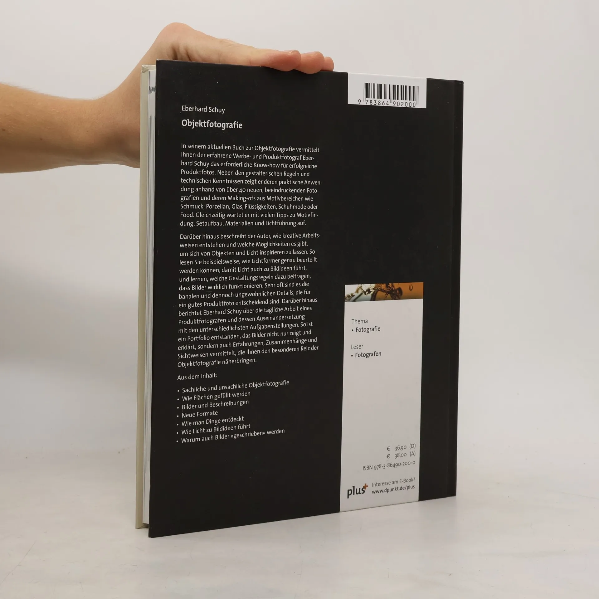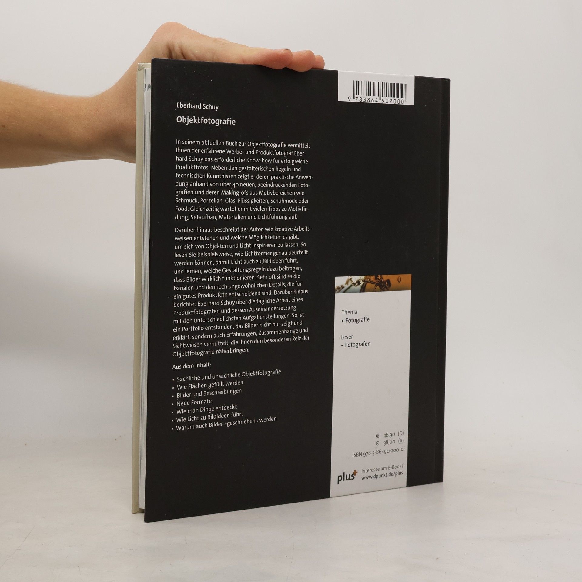 In seinem aktuellen Buch zur Objektfotografie vermittelt der erfahrene Werbe- und Produktfotograf Eberhard Schuy das erforderliche Know-how für erfolgreiche Produktfotos. Neben gestalterischen Regeln und technischen Kenntnissen zeigt er deren praktische Anwendung anhand von über 40 neuen Fotografien und deren Making-ofs aus Bereichen wie Schmuck, Porzellan, Glas, Flüssigkeiten, Schuhmode und Food. Er bietet viele Tipps zu Motivfindung, Setaufbau, Materialien und Lichtführung. Der Autor beschreibt, wie kreative Arbeitsweisen entstehen und wie man sich von Objekten und Licht inspirieren lassen kann. Sie erfahren, wie Lichtformer beurteilt werden, damit Licht zu Bildideen führt, und welche Gestaltungsregeln dazu beitragen, dass Bilder funktionieren. Oft sind es banale, jedoch ungewöhnliche Details, die für ein gutes Produktfoto entscheidend sind. Eberhard Schuy berichtet auch über die tägliche Arbeit eines Produktfotografen und die Auseinandersetzung mit verschiedenen Aufgabenstellungen. So entsteht ein Portfolio, das nicht nur Bilder zeigt und erklärt, sondern auch Erfahrungen und Sichtweisen vermittelt, die den besonderen Reiz der Objektfotografie näherbringen. Themen umfassen sachliche und unsachliche Objektfotografie, das Füllen von Flächen, neue Formate und die Entdeckung von Dingen.