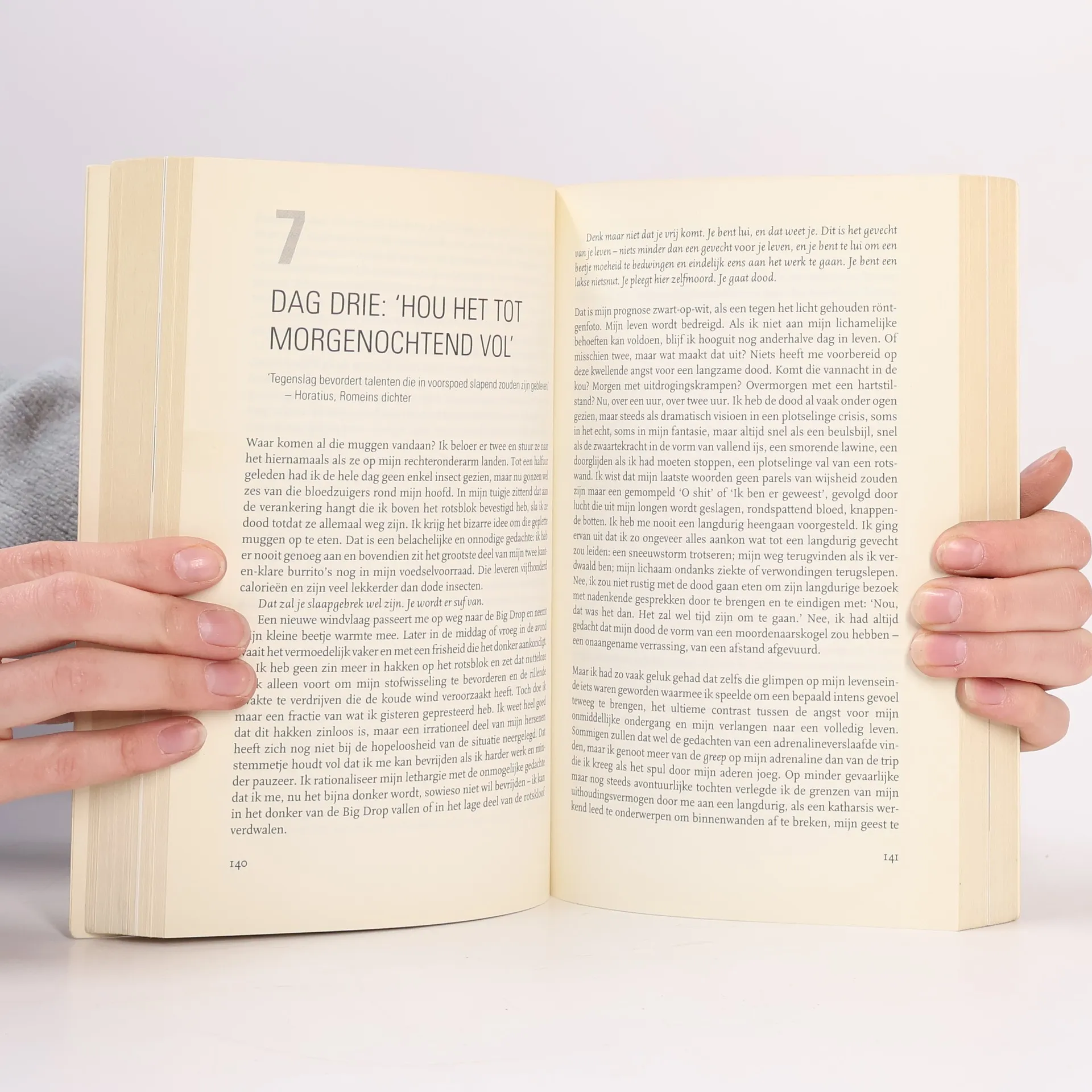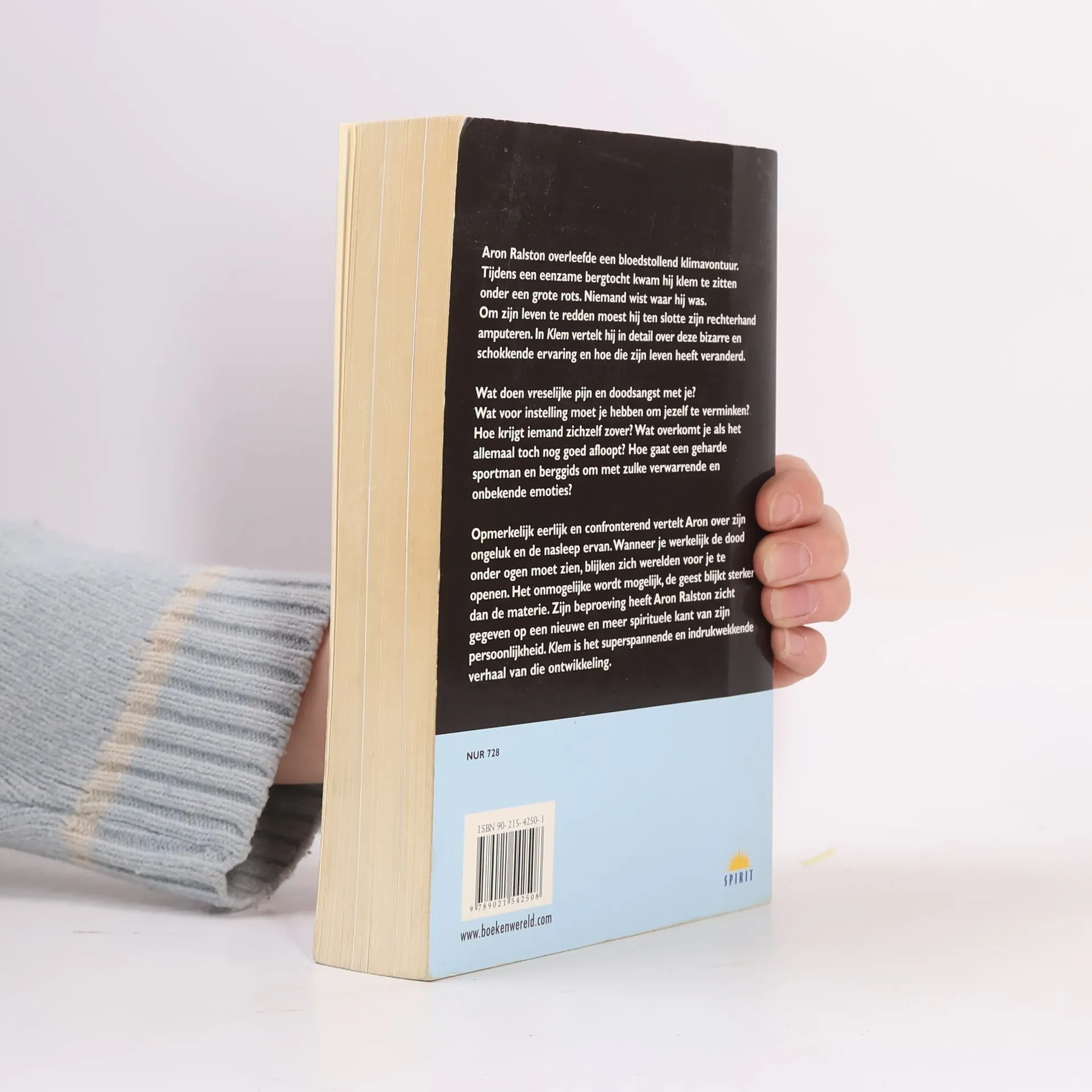 De auteur haalde vorig jaar de wereldpers als de man die zijn eigen hand amputeerde. Na vijf dagen vast te hebben gezeten onder een rotsblok bleef hem geen andere mogelijkheid. Hoe hij er uiteindelijk toe komt zichzelf te verminken, vertelt hij in een bloedstollend en op sommige momenten zeer aangrijpend relaas. Hij slaagt erin met zijn analytische geest de pijn, de verschillende stadia van radeloosheid en de euforie over zijn herwonnen vrijheid glashelder te beschrijven. Omdat hij de gebeurtenissen plaatst in het grotere geheel van zijn ontwikkeling als bergbeklimmer en ook ingaat op de veranderingen in zijn leven na het ongeluk, is een boek ontstaan dat de lezer niet snel zal vergeten. Het verdient zonder meer een plaats tussen de hoogtepunten van de bergsportliteratuur. Met verklarende woordenlijst en 2 katernen kleurenfoto's.