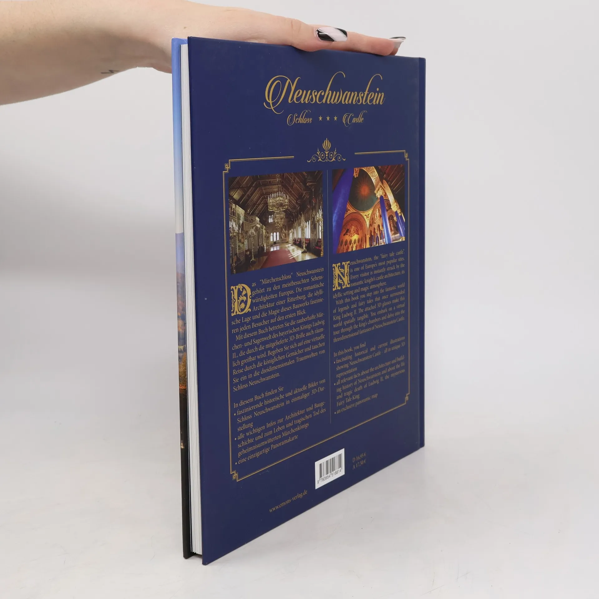 DAS SCHLO SS NEUSCHWANSTEIN ist nicht nur eines der berühmtesten Monumente der Welt, es ist auch eines der schönsten. Kaum jemand kann sich seinem Bann entziehen. Ein magisches Bauwerk: Wer sein Inneres betritt, wähnt sich in einer anderen Welt. Prunk allerorten, aufwendige Wandgemälde, schwere Gobelins, immer wiederkehrende Motive aus der Gralslegende, aus dem Parsifal, Wolfram von Eschenbachs mittelalterlichem Bestseller, verfasst Anfang des 13. Jahrhunderts, »Ideensteinbruch« Richard Wagners und Inspiration von König Ludwig II. Das wunderbar gestaltete Buch bietet einen unvergleichlichen Einblick in die faszinierende Welt des Märchenkönigs. Tauchen Sie über die beiliegende 3D-Brille ein in die Magie und den Zauber dreidimensionaler Abbildungen. Die Bilder werden räumlich greifbar, eine Illusion der Wirklichkeit tut sich auf.