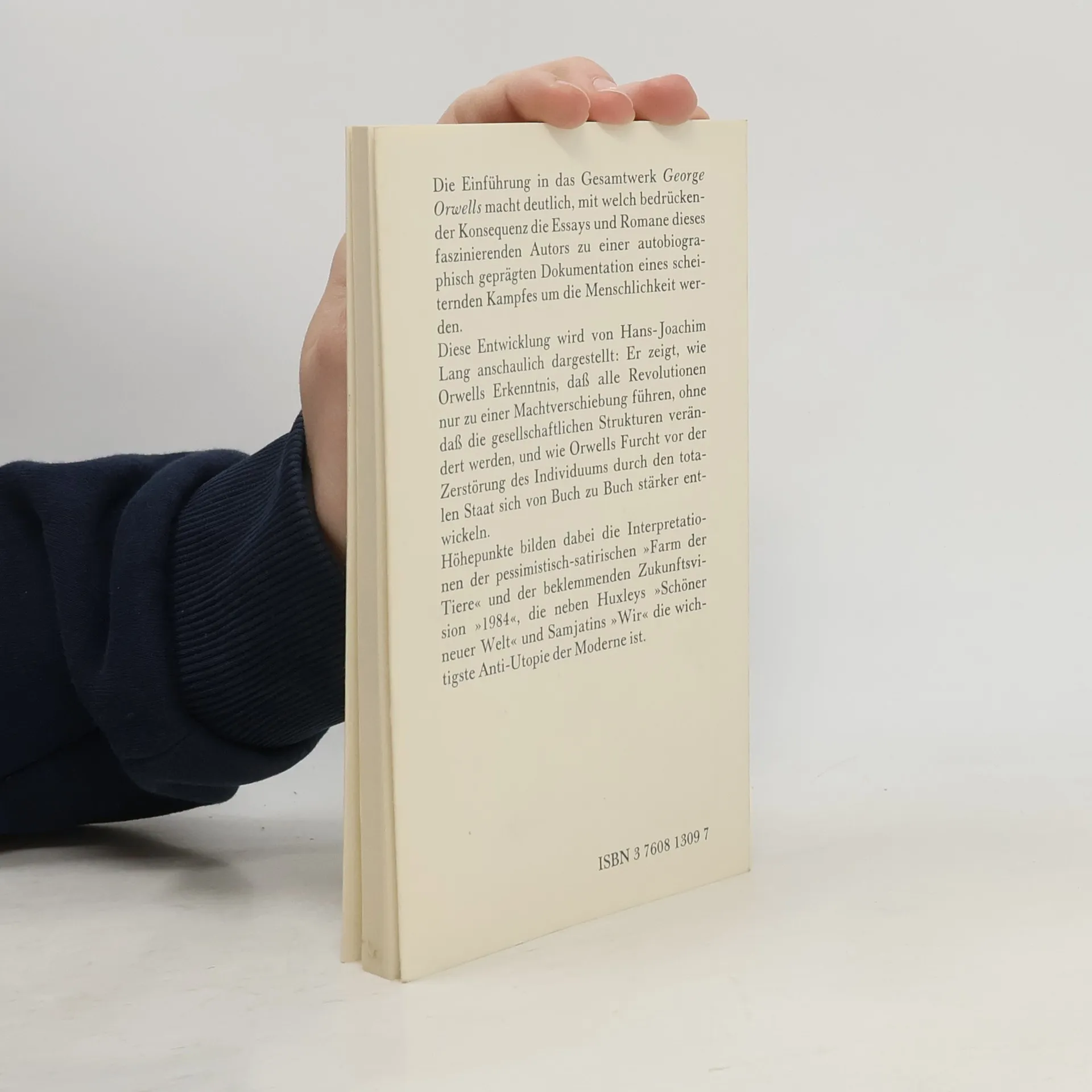 Die Einführung in das Gesamtwerk *George Orwells* macht deutlich, mit welch bedrückender Konsequenz die Essays und Romane dieses faszinierenden Autors zu einer autobiographisch geprägten Dokumentation eines scheiternden Kampfes um die Menschlichkeit werden. Diese Entwicklung wird von Hans-Joachim Lang anschaulich dargestellt: Er zeigt, wie Orwells Erkenntnis, daß alle Revolutionen nur zu einer Machtverschiebung führen, ohne daß die gesellschaftlichen Strukturen verändert werden, und wie Orwells Furcht vor der Zerstörung des Individuums durch den totalen Staat sich von Buch zu Buch stärker entwickeln. Höhepunkte bilden dabei die Interpretationen der pessimistisch-satirischen „Farm der Tiere“ und der beklemmenden Zukunftsvision „1984“, die neben Huxleys „Schöner neuer Welt“ und Samjatins „Wir“ die wichtigste Anti-Utopie der Moderne ist.