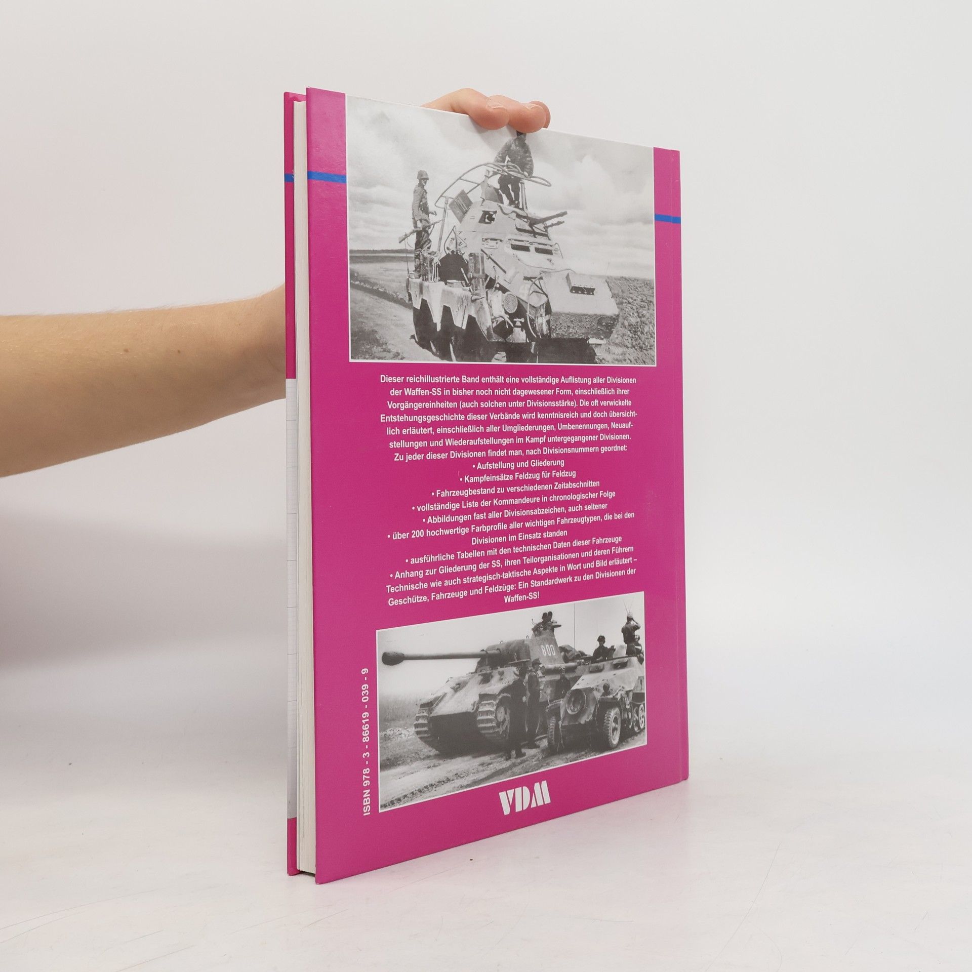 2. Verdenskrig. En billeddokumentation af SS-enheder indsat i Frankrig 1940, på Balkan i 1941, i Rusland 1941-1944, i Vesteuropa i forbindelse med invasionen i Normandiet 1944 og det efterfølgende tyske tilbagetog. Der er bl.a. billeder af Frikorps Danmark og andre landes frivillige SS-enheder i Rusland. Endvidere en oversigt over grader og gradstegn i Waffen SS.