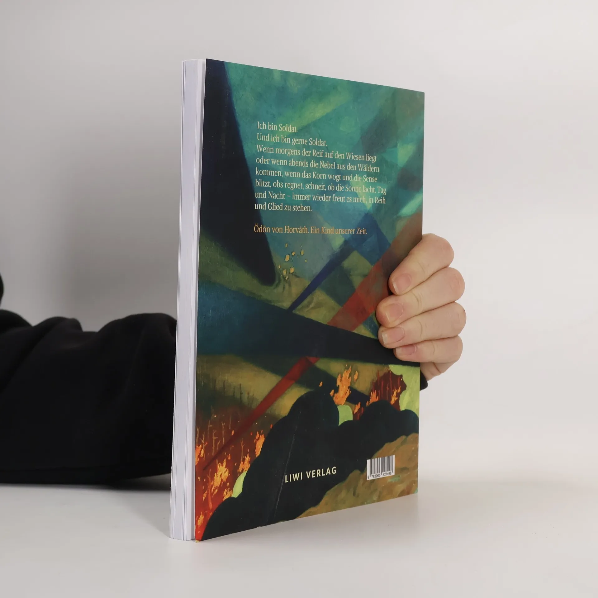 „Ich bin Soldat. Und ich bin gerne Soldat. Wenn morgens der Reif auf den Wiesen liegt oder wenn abends die Nebel aus den Wäldern kommen, wenn das Korn wogt und die Sense blitzt, obs regnet, schneit, ob die Sonne lacht, Tag und Nacht – immer wieder freut es mich, in Reih und Glied zu stehen." Ödön von Horváth. Ein Kind unserer Zeit. Erstdruck: Verlag Allert de Lange, Amsterdam 1938. Neuausgabe, Göttingen 2019. LIWI Literatur- und Wissenschaftsverlag