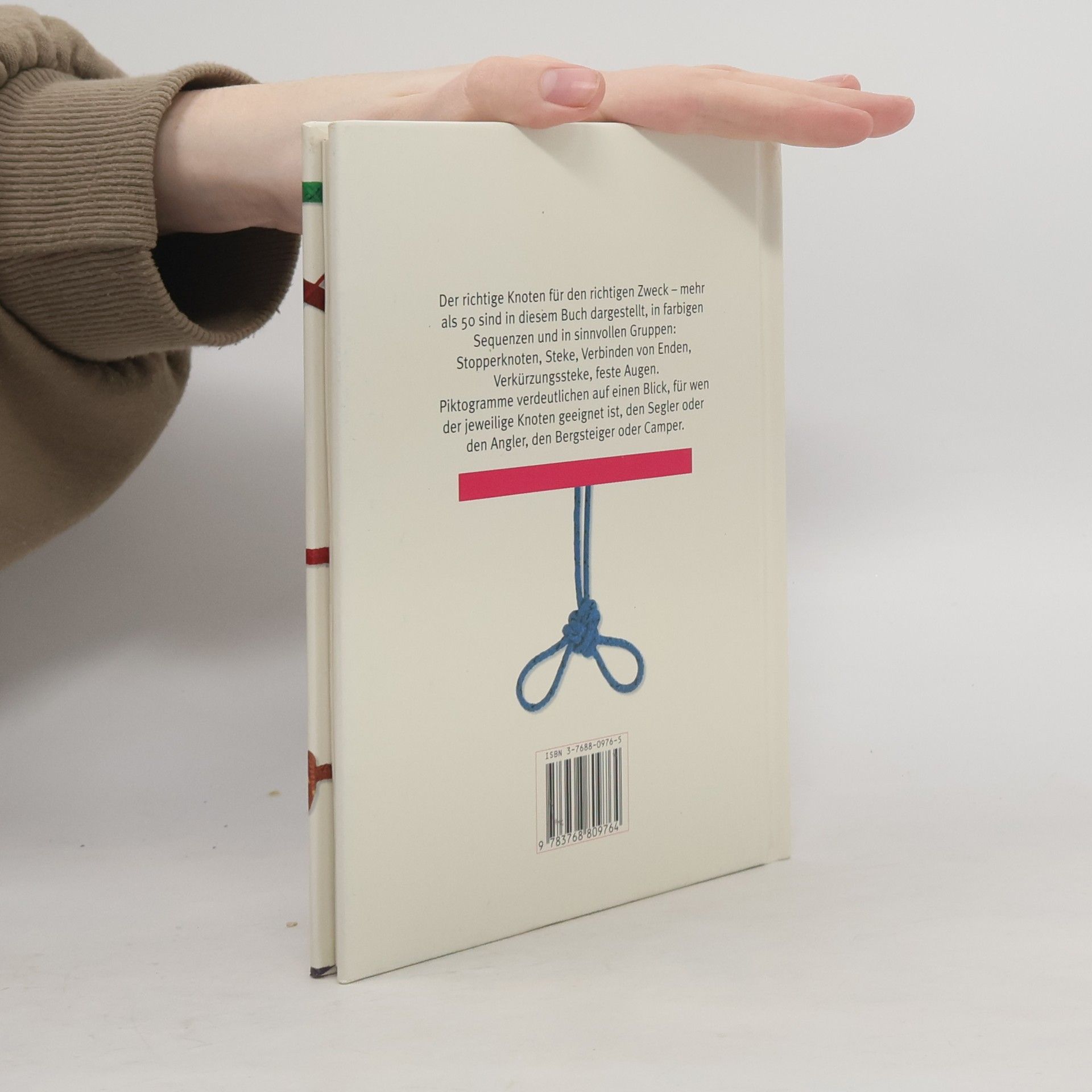 Der richtige Knoten für den richtigen Zweck – mehr als 50 Knoten sind in diesem Buch dargestellt, in farbigen Sequenzen un din sinnvollen Gruppen: Stopperknoten, Steke, Verbinden von Enden, Verkürzungssteke, feste Augen. Piktogramme verdeutlichen auf einen Blick, für wen der jeweilige Knoten geeignet ist, den Segler oder den Angler, den Bergsteiger oder Camper.