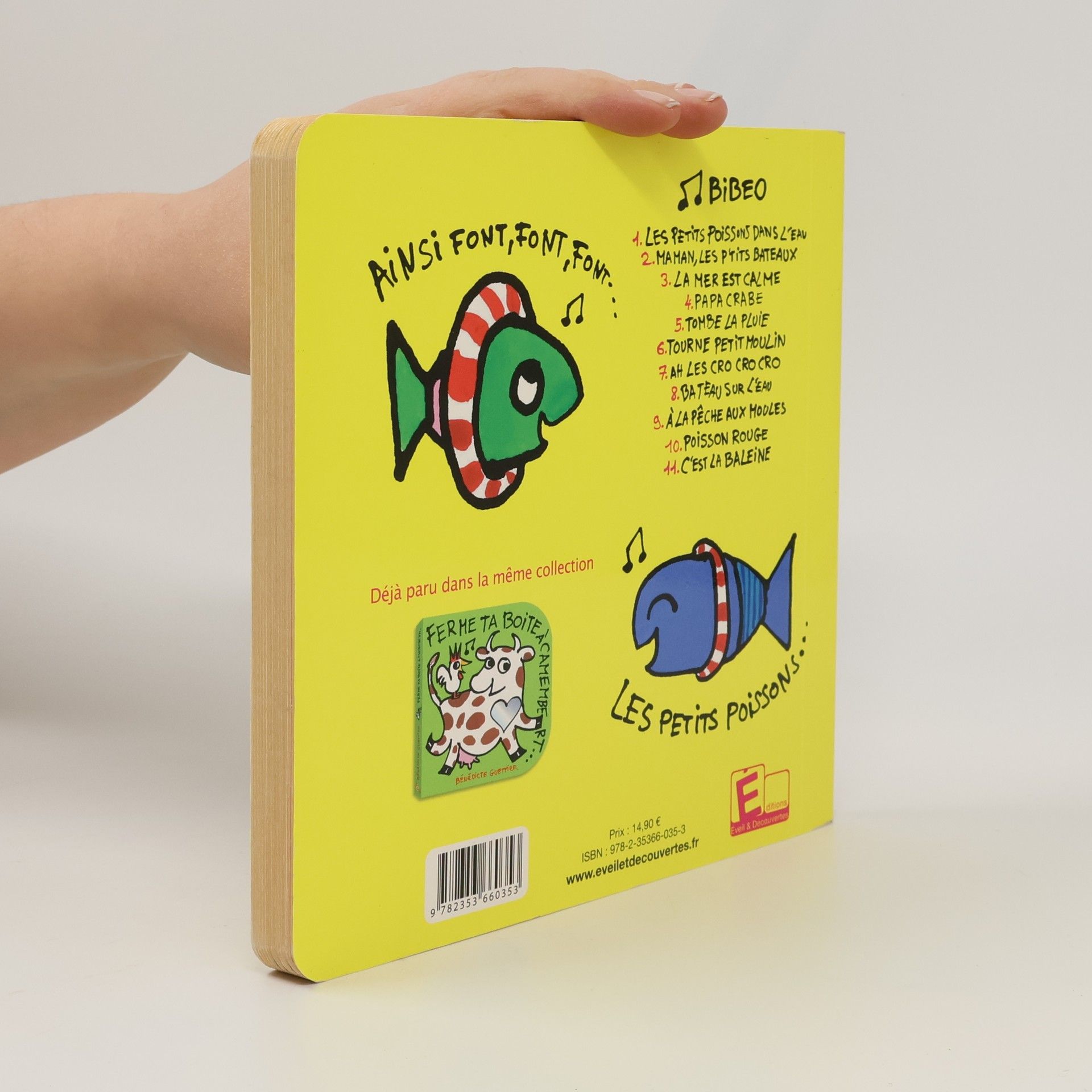 L'imagier sonore, un incontournable pour tous les petits! Bénédicte Guettier, célèbre créatrice de Trotro, détourne la recette traditionnelle une image-un son en illustrant onze comptines sur le thème des poissons et de la mer. Les illustrations pleines d'humour et de gaieté promettent des moments de bonne humeur autour d'un outil d'éveil attrayant. Orchestration et interprétation originale: groupe Bibeo.