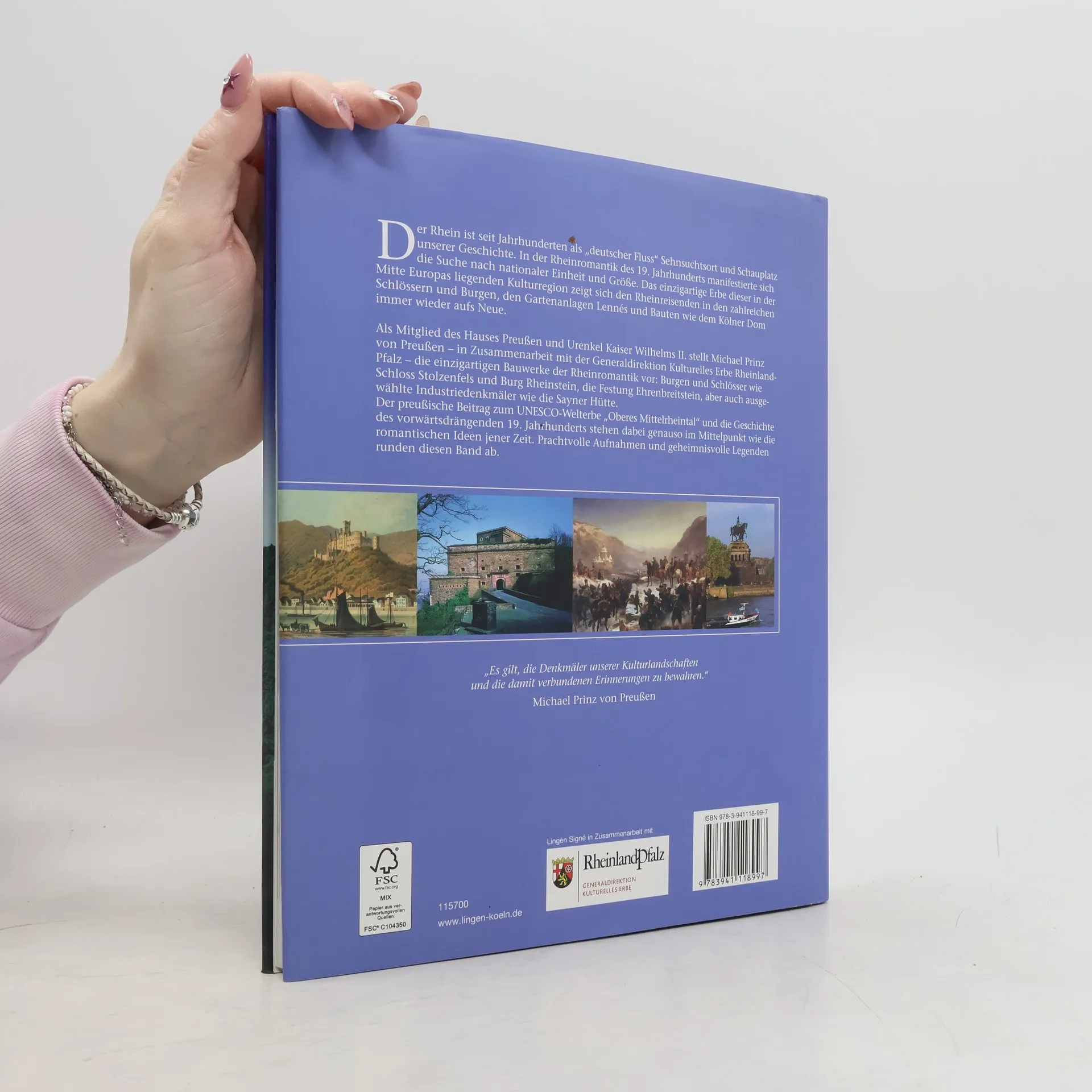 Das UNESCO-Welterbe Oberes Mittelrheintal wird 2011 einige besondere Höhepunkte aufbieten können: Im Rahmen der Bundesgartenschau in Koblenz präsentiert sich die Preußische Festung Ehrenbreitstein nach umfassender Renovierung als „Kultur-Festung“ und auch Schloss Stolzenfels und die Lenné-Gärten erstrahlen in neuem Glanz. Auf lebendige und anschauliche Weise verschafft dieses S. K. H. Michael Prinz von Preußen herausgegebene und in enger Zusammenarbeit mit der GDKE entstandene Buch einen Überblick über die eindrucksvollen preußischen Bauten am Rhein. Die Entstehung, Funktion und Architektur der Kirchen, Schlösser, Burgen und Festungen, aber auch ausgewählter Industriedenkmäler werden vorgestellt. Spannende Geschichten und Legenden bringen den Lesern dieses einzigartige Kulturerbe nahe. Im Mittelpunkt stehen dabei die Rheinromantik un der Bezug zur preußischen Geschichte. Der Reiz dieser Epoche und des kulturellen Erbes eines vorwärtsdrängenden 19. Jahrhunderts haben bis heute nichts von ihrer Faszination verloren und ziehen jährlich unzählige Touristen in eine der schönsten Regionen Deutschlands.