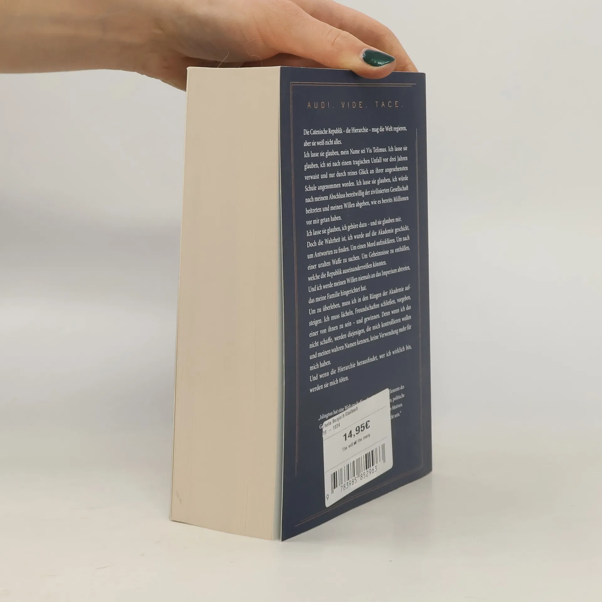 AUDI. VIDE. TACE. Die Catenische Republik regiert die Welt, doch sie kennt nicht die ganze Wahrheit. Ich lasse sie glauben, ich heiße Vis Telimus, ein Waise, der durch Glück an ihrer angesehensten Schule aufgenommen wurde. Sie denken, ich werde nach meinem Abschluss der zivilisierten Gesellschaft beitreten und meinen Willen abgeben, wie viele vor mir. Doch in Wirklichkeit bin ich hier, um Antworten zu finden: einen Mord aufzuklären, eine uralte Waffe zu suchen und Geheimnisse zu enthüllen, die die Republik zerreißen könnten. Ich werde meinen Willen niemals an das Imperium abtreten, das meine Familie hingerichtet hat. Um zu überleben, muss ich in der Akademie aufsteigen, lächeln, Freundschaften schließen und vorgeben, einer von ihnen zu sein – und gewinnen. Denn wenn ich scheitere, werden die, die mich kontrollieren wollen und meinen wahren Namen kennen, keine Verwendung mehr für mich haben. Und wenn die Hierarchie herausfindet, wer ich wirklich bin, werde ich sterben. Islington schafft eine Welt, die komplexe Magie, bedrohliche Gefahren, politische Intrigen und vielschichtige Charaktere vereint. Fans epischer Fantasy werden nicht enttäuscht sein. „Erinnert an Robert Jordan oder Brandon Sanderson: Islingtons Schreibstil ist erfrischend rasant.“ — Booklist.