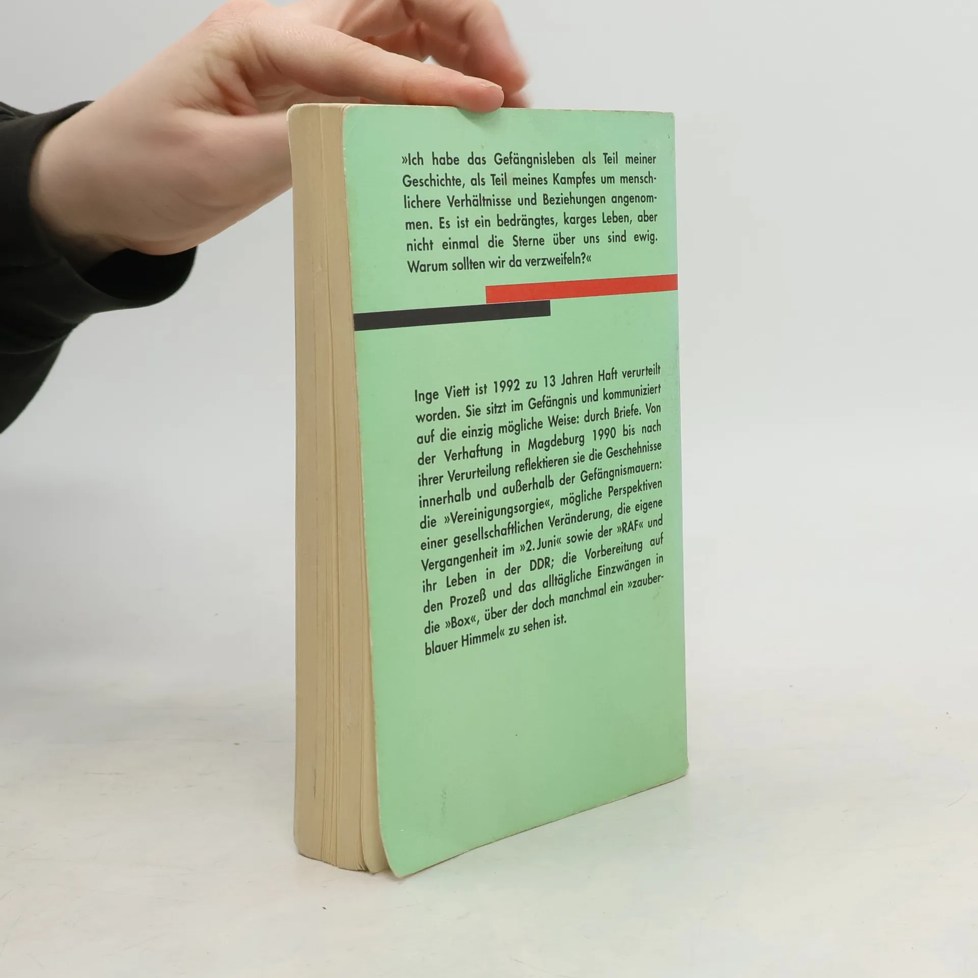 Inge Viett ist 1992 zu 13 Jahren Haft verurteilt worden. Sie sitzt im Gefängnis und kommuniziert auf die einzig mögliche Weise: durch Briefe. Von der Verhaftung in Magdeburg 1990 bis nach ihrer Verurteilung reflektieren sie die Geschehnisse innerhalb und außerhalb der Gefängnismauern: die 'Vereinigungsorgie', mögliche Perspektiven einer gesellschaftlichen Veränderung, die eigene Vergangenheit im '2. Juni' sowie der RAF und ihr Leben in der DDR; die Vorbereitung auf den Prozess und das alltägliche Einzwängen in die 'Box', über der doch manchmal ein 'zauberblauer Himmel' zu sehen ist.