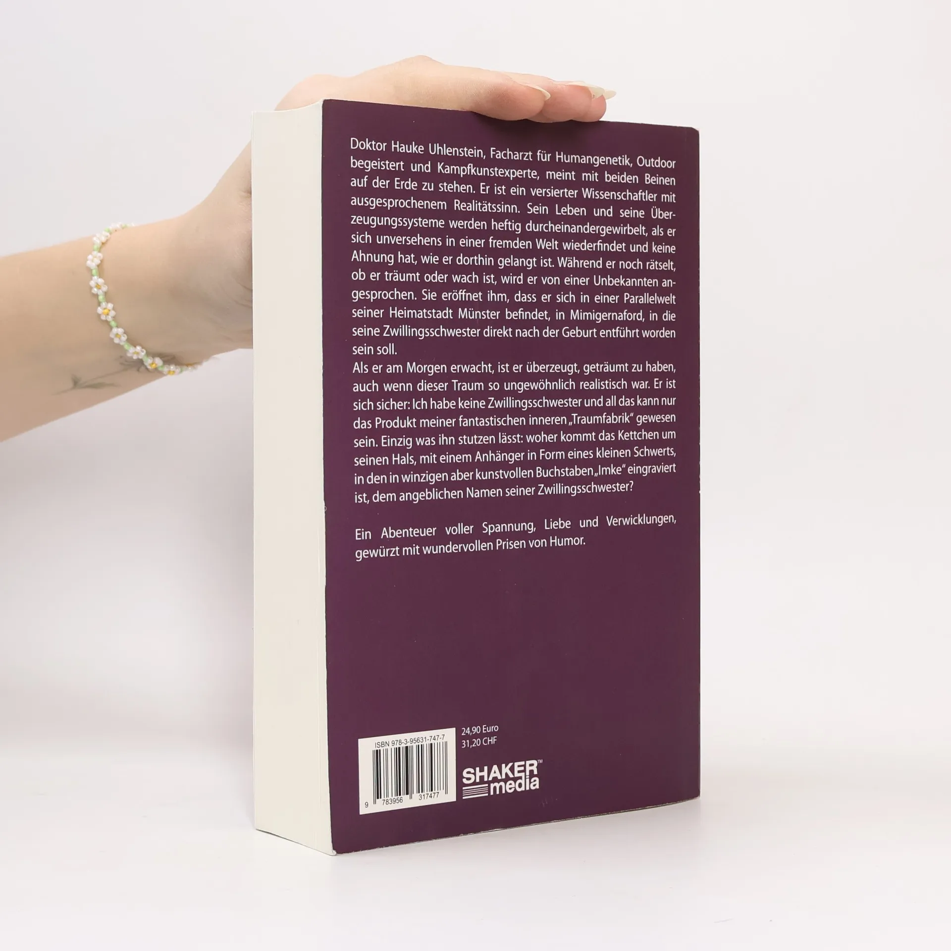 Doktor Hauke Uhlenstein, Facharzt für Humangenetik, Outdoor begeistert und Kampfkunstexperte, meint mit beiden Beinen auf der Erde zu stehen. Er ist ein versierter Wissenschaftler mit ausgesprochenem Realitätssinn. Sein Leben und seine Überzeugungssysteme werden heftig durcheinandergewirbelt, als er sich unversehens in einer fremden Welt wiederfindet und keine Ahnung hat, wie er dorthin gelangt ist. Während er noch rätselt, ob er träumt oder wach ist, wird er von einer Unbekannten angesprochen. Sie eröffnet ihm, dass er sich in einer Parallelwelt seiner Heimatstadt Münster befindet, in Mimigernaford, in die seine Zwillingsschwester direkt nach der Geburt entführt worden sein soll. Als er am Morgen erwacht, ist er überzeugt, geträumt zu haben, auch wenn dieser Traum so ungewöhnlich realistisch war. Er ist sich sicher: Ich habe keine Zwillingsschwester und all das kann nur das Produkt meiner fantastischen inneren „Traumfabrik“ gewesen sein. Einzig was ihn stutzen lässt: woher kommt das Kettchen um seinen Hals, mit einem Anhänger in Form eines kleinen Schwerts, in den in winzigen aber kunstvollen Buchstaben „Imke“ eingraviert ist, dem angeblichen Namen seiner Zwillingsschwester? Ein Abenteuer voller Spannung, Liebe und Verwicklungen, gewürzt mit wundervollen Prisen von Humor.