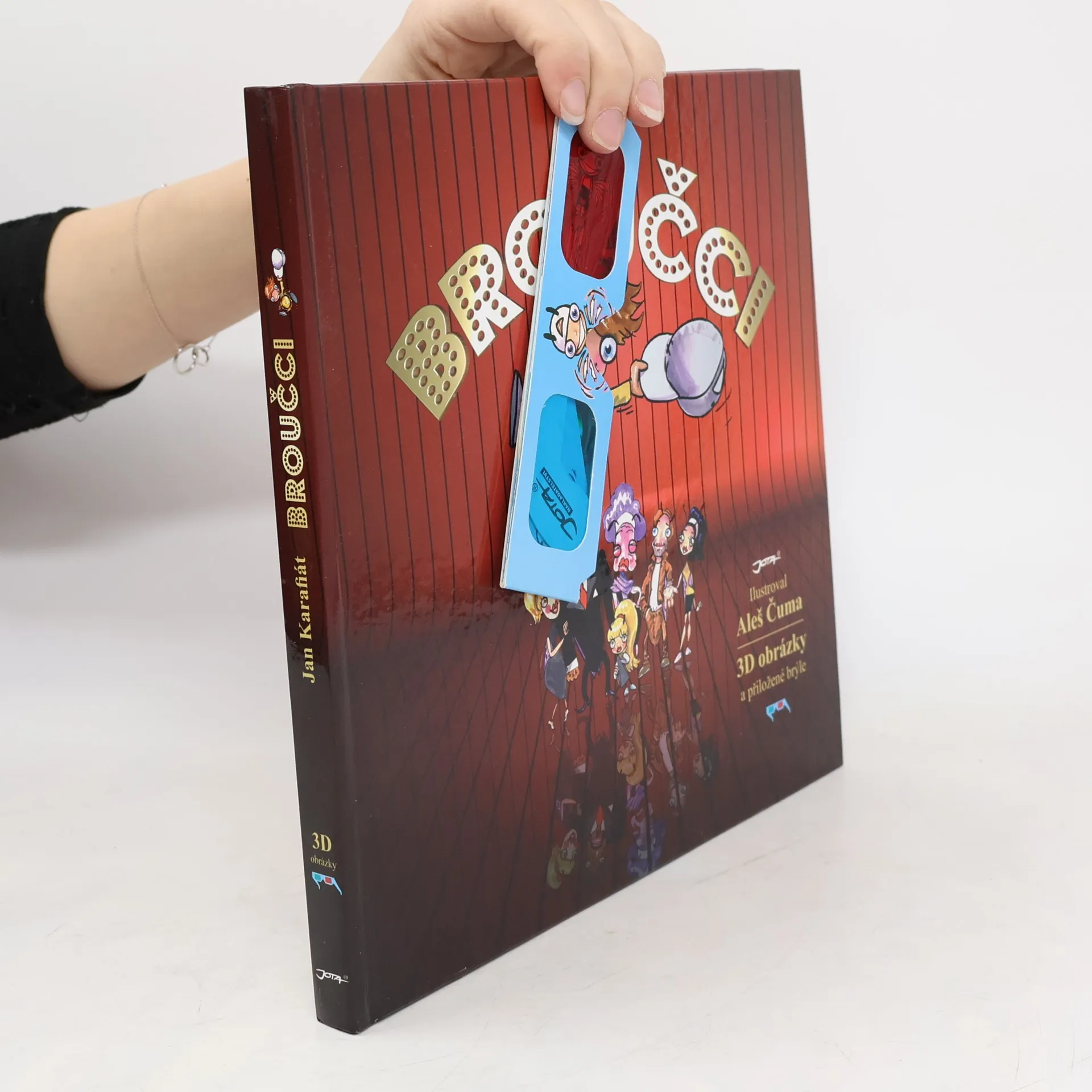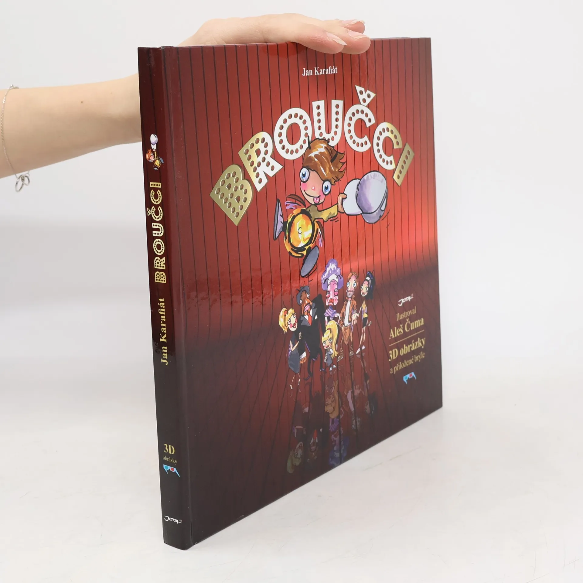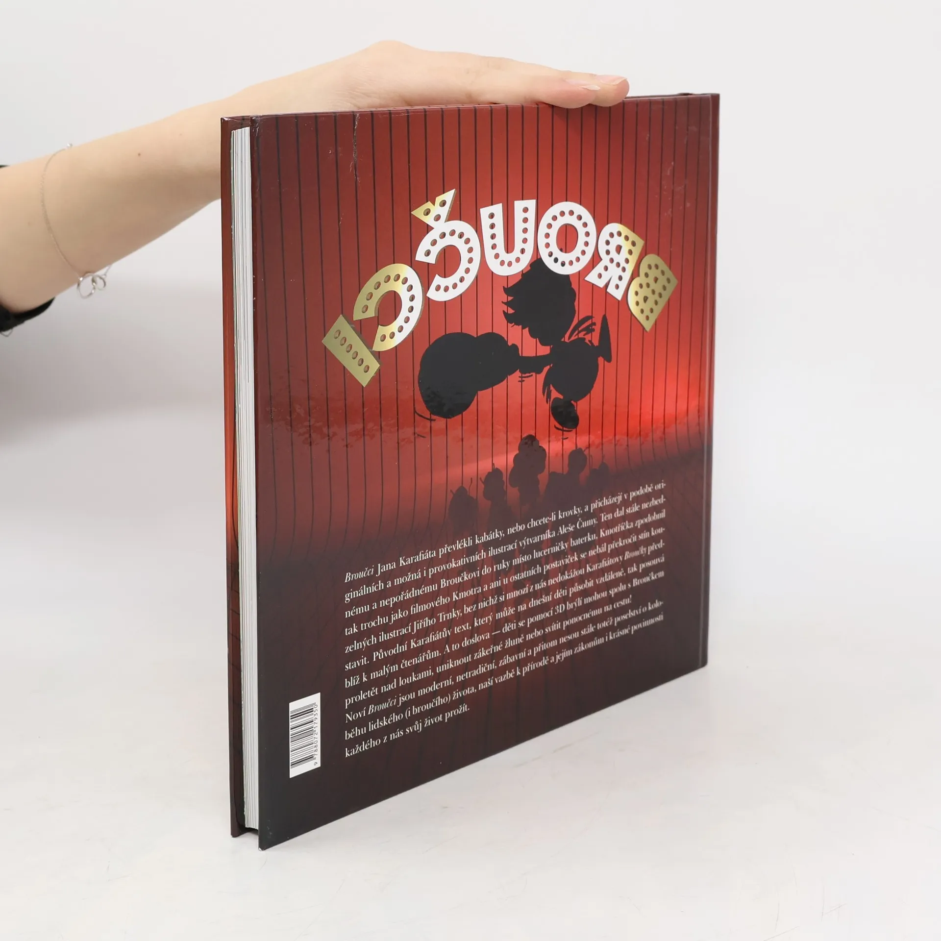 Broučci poprvé v 3D! Broučci Jana Karafiáta převlékli kabátky, nebo chcete-li krovky, a přichází v podobě originálních a možná i provokativních ilustrací výtvarníka Aleše Čumy. Ten dal stále nezbednému a nepořádnému Broučkovi do ruky místo lucerničky baterku, Kmotříčka zpodobnil tak trochu jako filmového Kmotra a ani u ostatních postaviček se nebál překročit stín kouzelných ilustrací Jiřího Trnky, bez nichž si mnozí z nás nedokážou Karafiátovy Broučky představit. Původní Karafiátův text, který může na dnešní děti působit vzdáleně, tak posouvá blíž k malým čtenářům. A to doslova - děti se pomocí 3D brýlí mohou spolu s Broučkem proletět nad loukami, uniknout zákeřné žluně nebo svítit ponocnému na cestu! Noví Broučci jsou moderní, netradiční, zábavní a přitom nesou stále totéž poselství o koloběhu lidského (i broučího) života, naší vazbě k přírodě a jejím zákonům i krásné povinnosti každého z nás svůj život prožít. Součástí knihy jsou 3D brýle.