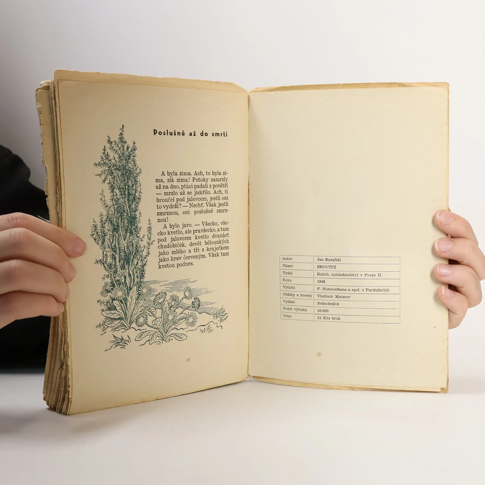Broučky, jediné umělecké literární dílo Jana Karafiáta (1846–1929), potkaly nejednoduché osudy. Roku 1876 anonymně vyšel skromný, neilustrovaný svazek – tehdy s názvem Broučci pro malé i velké děti – a zapadl vcelku bez povšimnutí. Až teprve po sedmnácti letech knížku objevil a zpopularizoval novinář Gustav Jaroš, který ji označil jako „snad nejkrásnější květ naší české literatury dětské“ a jejího autora nazval „českým Andersenem“. Poetická obraznost Broučků, citlivý přírodní lyrismus a ušlechtilý humanismus si dále uchovávají nepomíjející platnost. I jazykově, svým jadrným básnickým slohem šťastně spojujícím hovorovost lidové řeči s vytříbenými biblismy, je dílo Jana Karafiáta pozoruhodné. Čtenářsky i posluchačsky stále přitažlivé zůstávají postavičky malých hrdinů, broučků a berušek, které při všech svých světlých stránkách nejsou zbaveny pravdivých lidských vlastností. Spolehlivým průvodcem Broučků jsou ilustrace národního umělce Jiřího Trnky, které přes časový odstup od svého vzniku na počátku čtyřicátých let nic nepozbyly ze svého půvabu.