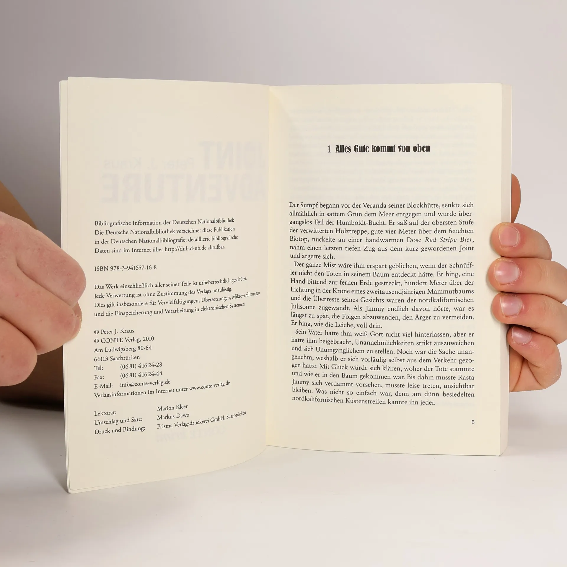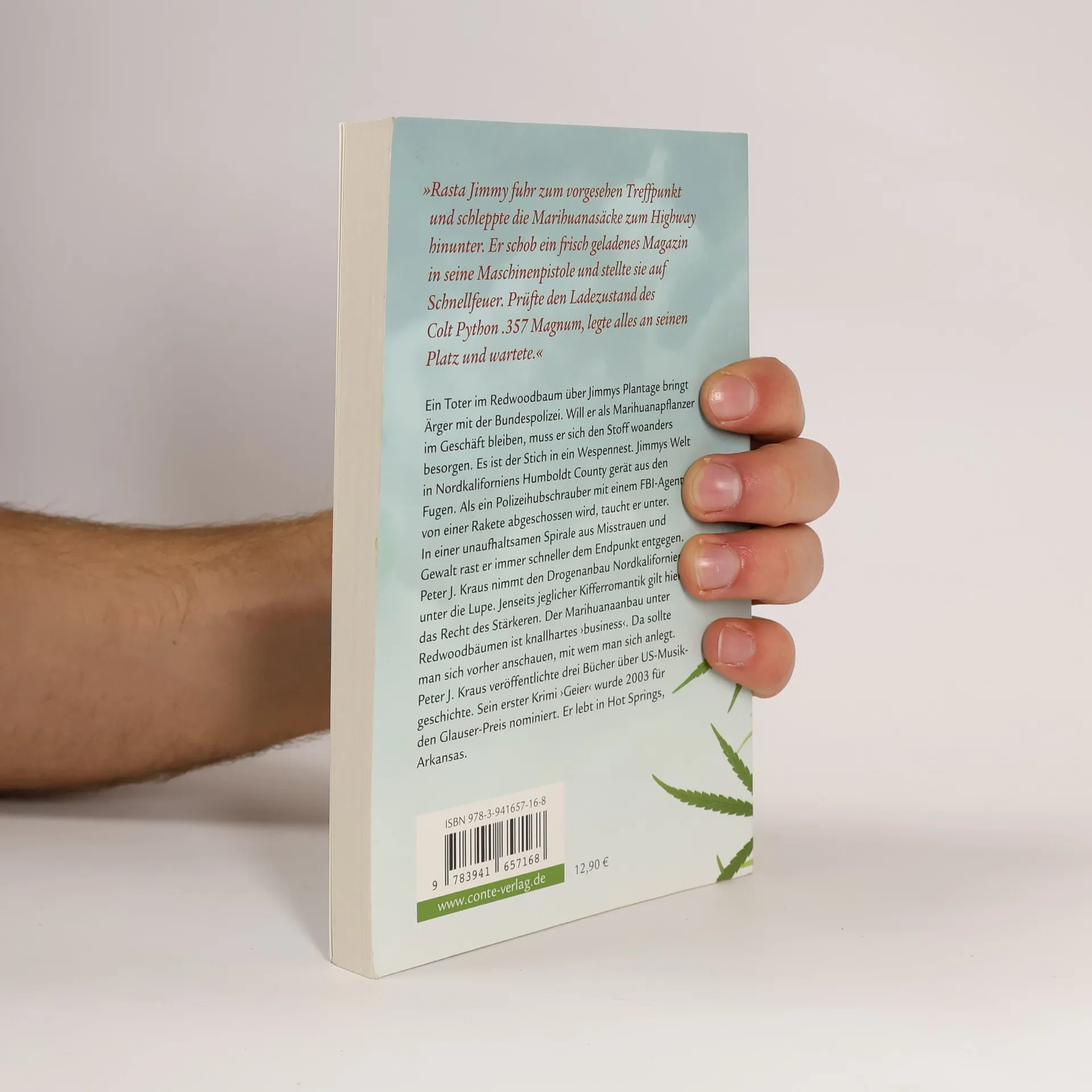 Ein Toter im Redwoodbaum über Jimmys Plantage bringt Ärger mit der Bundespolizei. Will er als Marihuanapflanzer im Geschäft bleiben, muss er sich den Stoff woanders besorgen. Es ist der Stich in ein Wespennest. Jimmys Welt in Nordkaliforniens Humboldt County gerät aus den Fugen. Als ein Polizeihubschrauber mit einem FBI-Agenten von einer Rakete abgeschossen wird, taucht er unter. In einer unaufhaltsamen Spirale aus Misstrauen und Gewalt rast er immer schneller dem Endpunkt entgegen. Peter J. Kraus nimmt den Drogenanbau Nordkaliforniens unter die Lupe. Jenseits jeglicher Kifferromantik gilt hier das Recht des Stärkeren. Der Marihuanaanbau unter Redwoodbäumen ist knallhartes "business". Da sollte man sich vorher anschauen, mit wem man sich anlegt. Peter J. Kraus wurde 1941 in Deutschland geboren und kam als Kind mit seiner Familie in die USA. Er war Kaufmann, Rennfahrer, Radio DJ in Santa Barbara, Kalifornien. In den Neunzigern veröffentlichte er drei Bücher über amerikanische Musikgeschichte. 2003 folgte sein erster Krimi "Geier", der für den Glauser-Preis nominiert wurde. Heute lebt er in Hot Springs, Arkansas. Im Conte Verlag erschien neben "Joint Adventure" (2010) "Cattolini erbt" (2012).