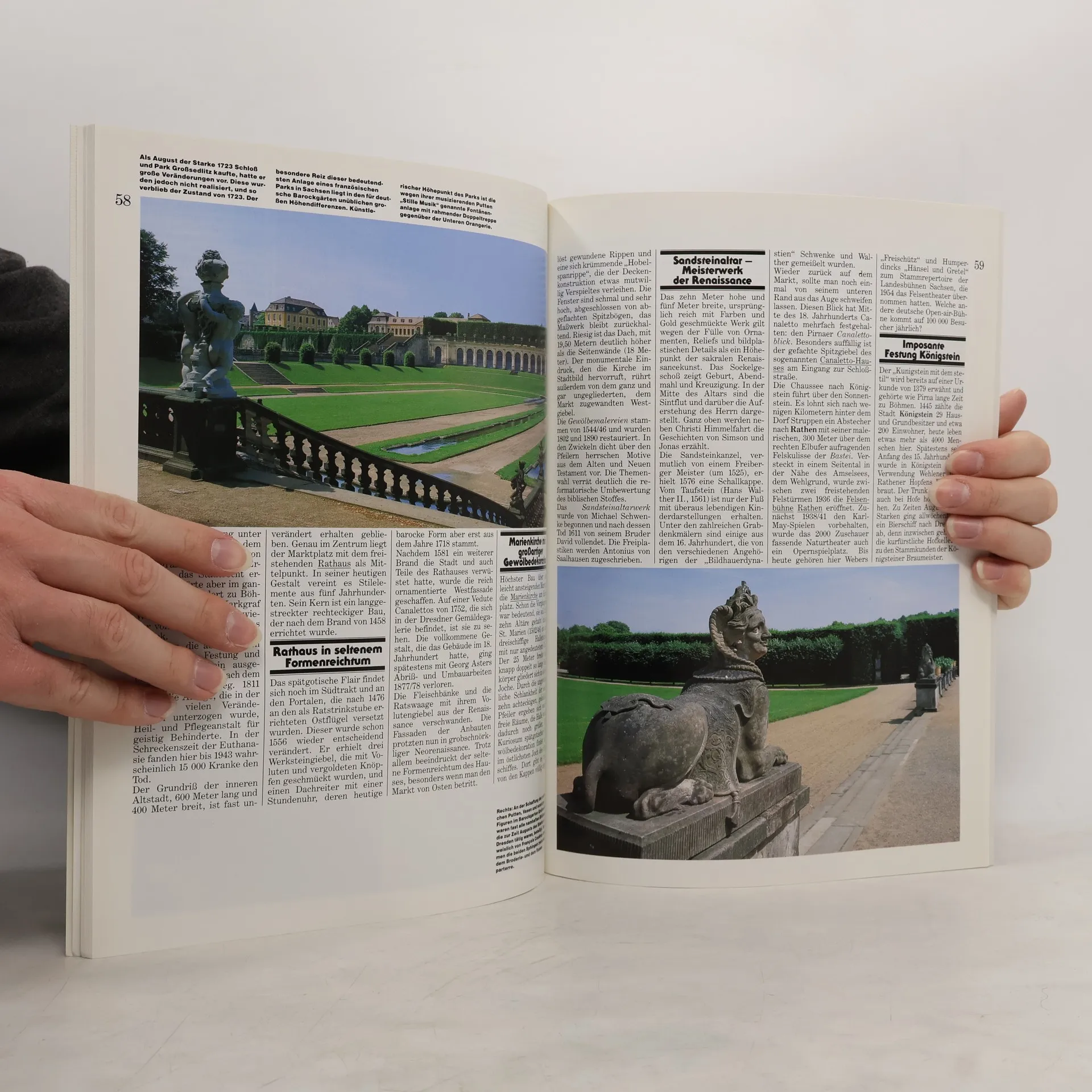 Schöpfer der Dresdner Kulturlandschaft: August der Starke; festlicher Jagdsitz Moritzburg, exotisches Lustschloss Pillnitz; die alte Markgrafenstadt Meissen; Spitzenwerder Kunst in den Museen; Pirna, Tor zur Sächsischen Schweiz; über der Elbe: Festung Königstein; Sonderteil: C. D. Friedrich, wiederentdeckter Maler der Romantik