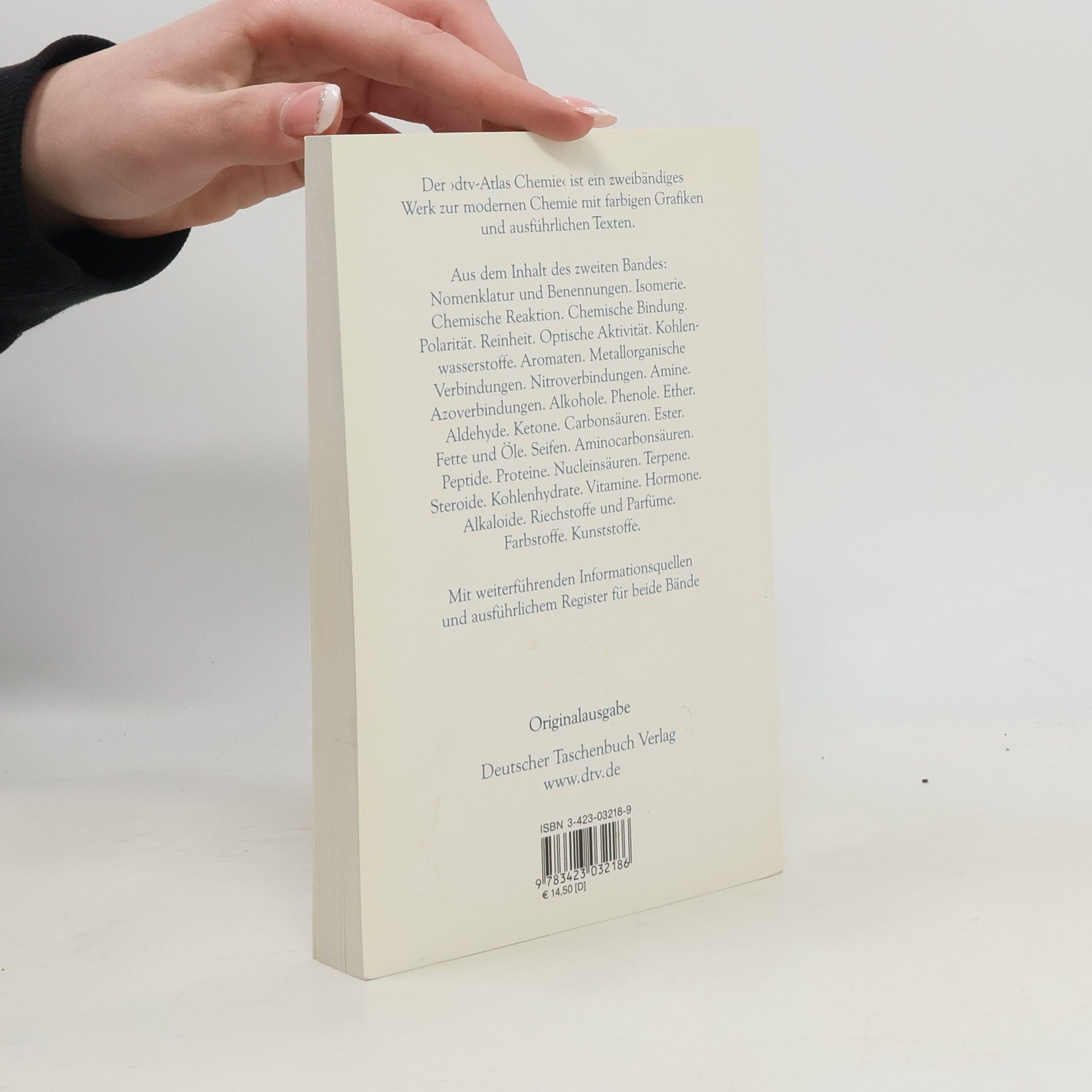 Grundlagen und Ergebnisse der modernen Chemie Der dtv-Atlas zur Chemiewendet sich an Schüler, Laboranten, Techniker, Studenten, Lehrer und alle, die sich über den neuesten Stand in der Chemie informieren wollen. Band 2: Nomenklatur und Benennungen. Isomerie. Chemische Reaktion. Chemische Bindung. Polarität. Reinheit. Optische Aktivität. Kohlenwasserstoffe. Aromaten. Metallorganische Verbindungen. Nitroverbindungen. Amine. Azoverbindungen. Alkohole. Phenole. Ether. Carbonsäuren. Peptide. Proteine. Nucleinsäuren. Kohlenhydrate. Vitamine. Hormone. Farbstoffe. Kunststoffe. u. v. m.
